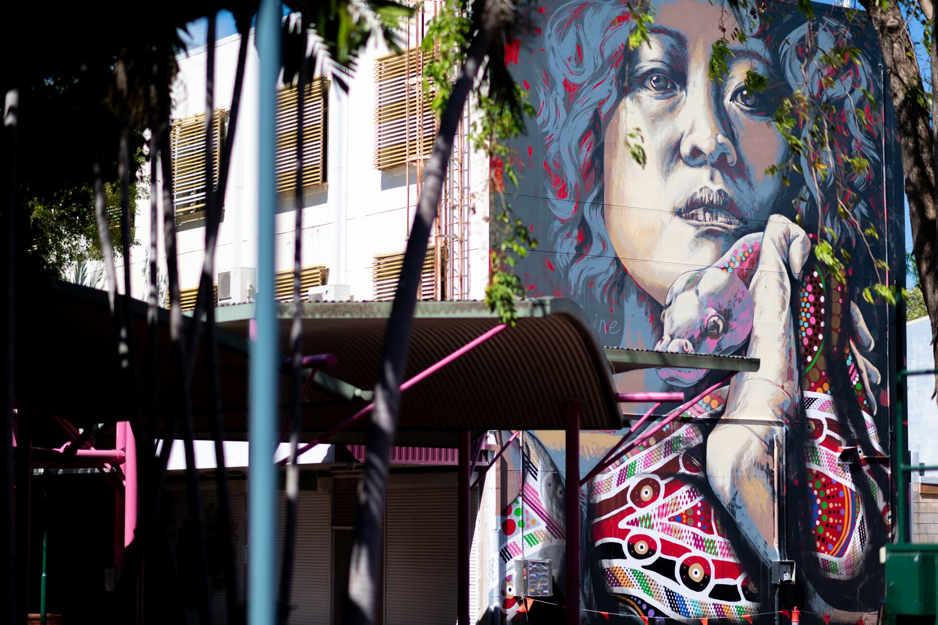 Two street artists have painted a three-storey mural depicting a Larrakia woman holding a powerful python in the back streets of the Darwin suburb of Nightcliff.