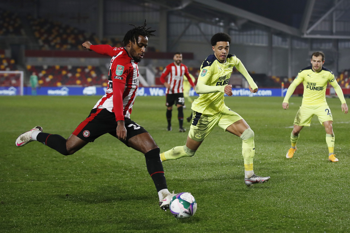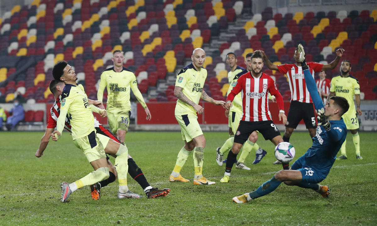 Soccer Football - Carabao Cup - Quarter-Final - Brentford v Newcastle United - Brentford Community Stadium, London, Britain - December 22, 2020 Brentford's Luke Daniels in action with Newcastle United's Sean Longstaff Action Images via Reuters/Matthew ChildsSoccer Football - Carabao Cup - Quarter-Final - Brentford v Newcastle United - Brentford Community Stadium, London, Britain - December 22, 2020 Brentford's Tariqe Fosu in action with Newcastle United's Jamal Lewis Action Images via Reuters/Matthew Childs