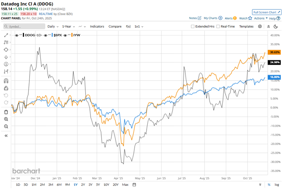 Shares of Datadog have increased 27.7% over the past 52 weeks, outperforming the broader S&P 500 Index's ($SPX) nearly 17% gain. However, the stock has lagged behind the iShares U.S. Technology ETF's (IYW) 31.6% return over the same period.