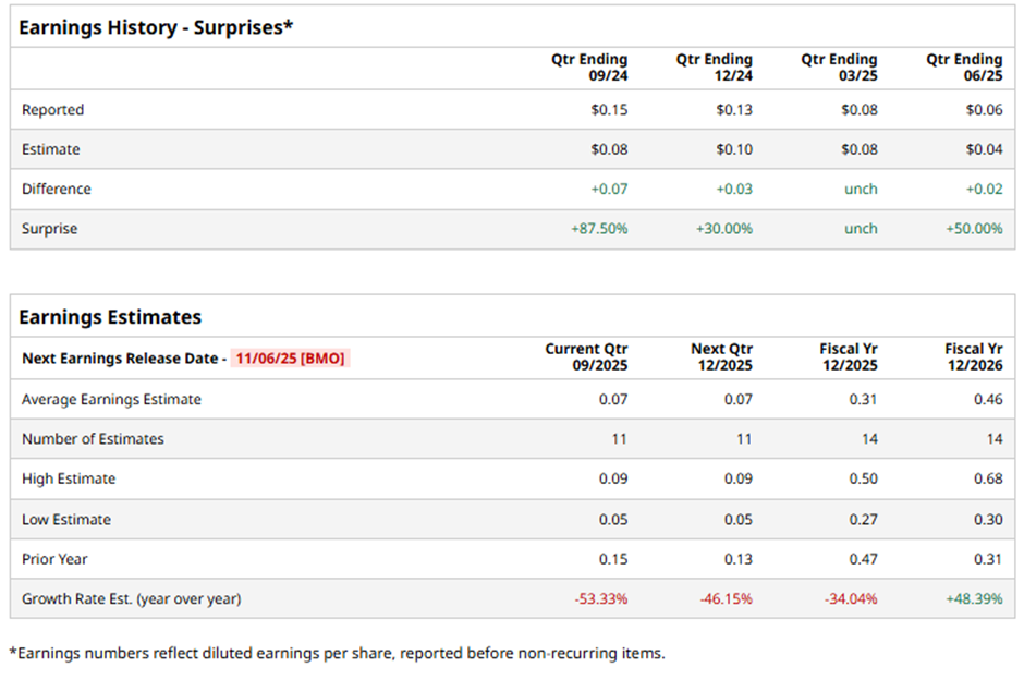 The New York-based company is slated to announce its fiscal Q3 2025 results before the market opens on Thursday, Nov. 6. Ahead of this event, analysts expect Datadog to report a profit of $0.07 per share, a 53.3% decline from $0.15 per share in the year-ago quarter. However, it has exceeded or met Wall Street's earnings expectations in the past four quarters.