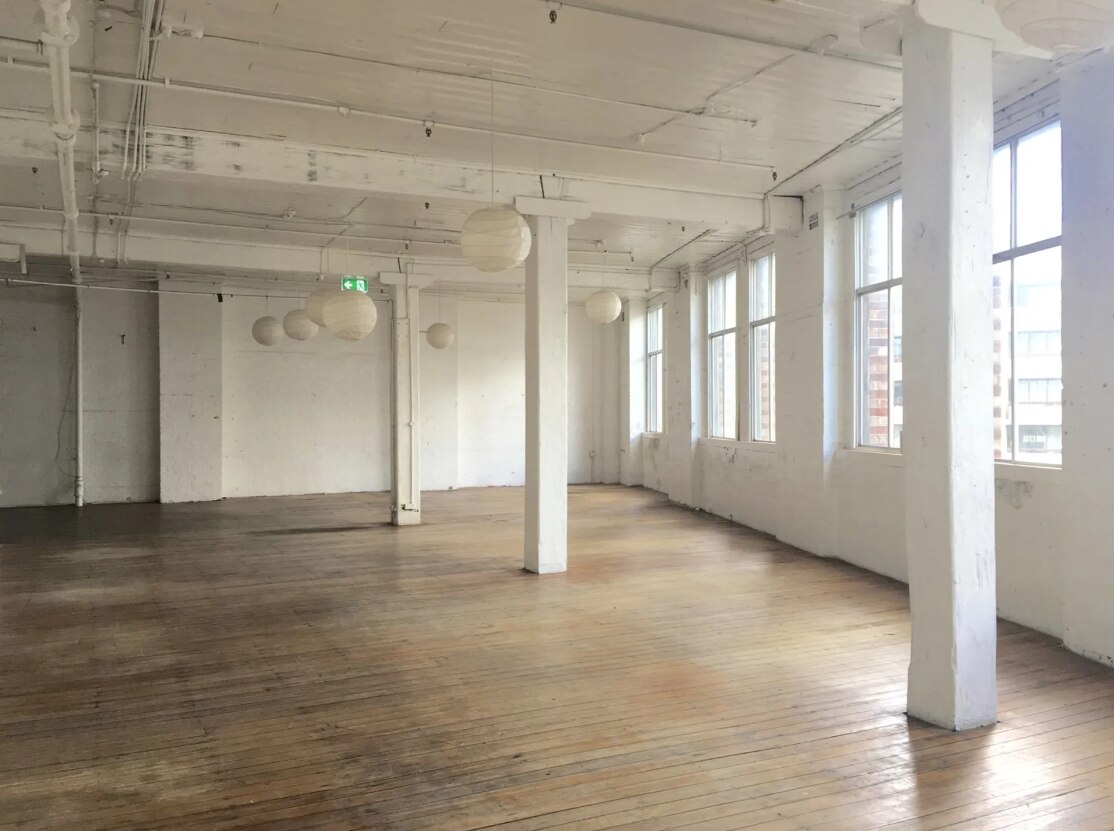 Real estate photos from 2017 depict a bright, warehouse-style space for lease as office space.