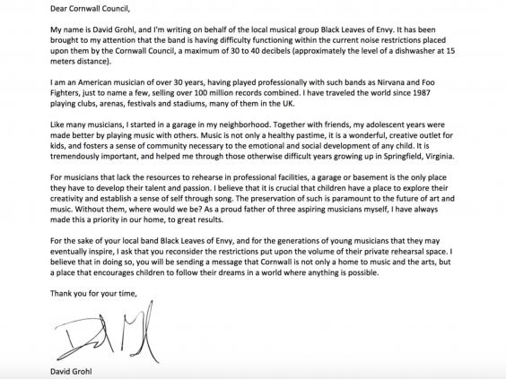 Mr Grohl wrote an open letter to Cornwall Council asking them to "reconsider the restrictions".