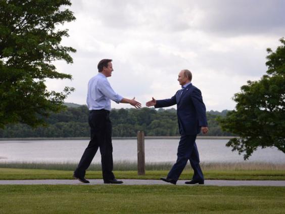 A slightly menacing sign of Russian strength is on display behind Mr Cameron’s desk, where four ornamental swords sit on the mantelpiece, including one from Mr Putin. “There’s probably a listening device in there,” the PM jokes as he poses for photographs.