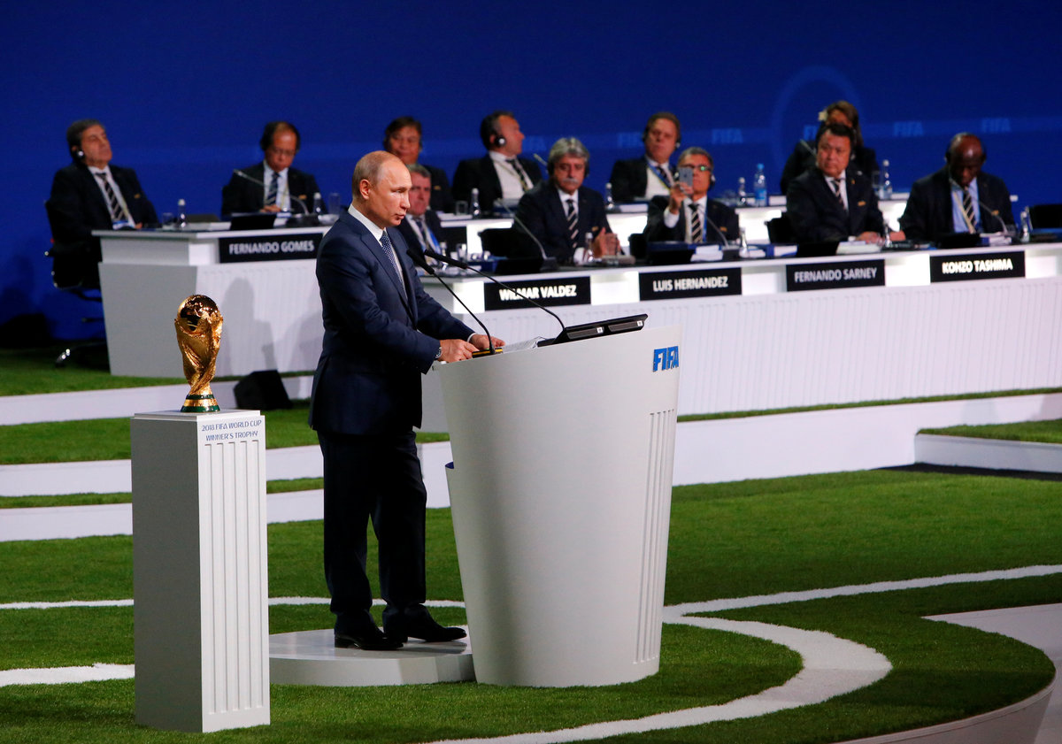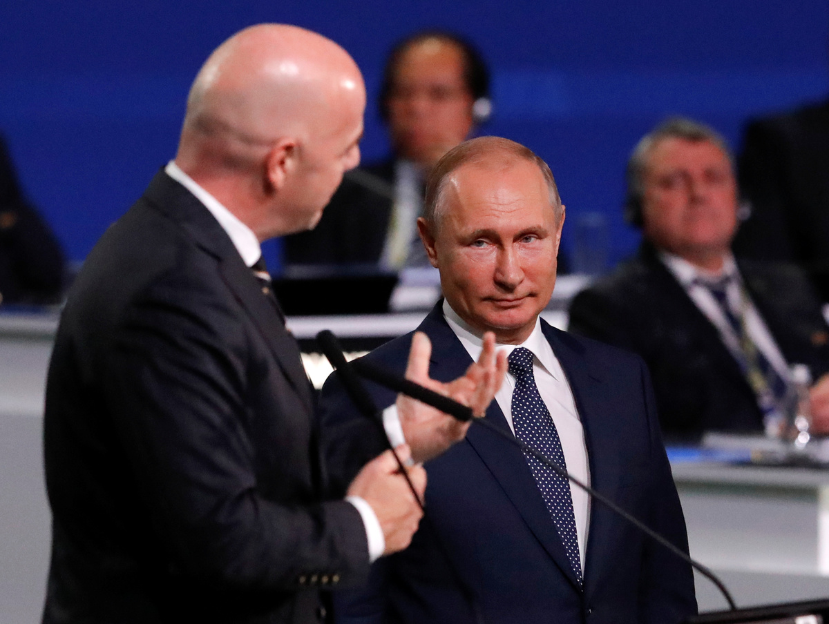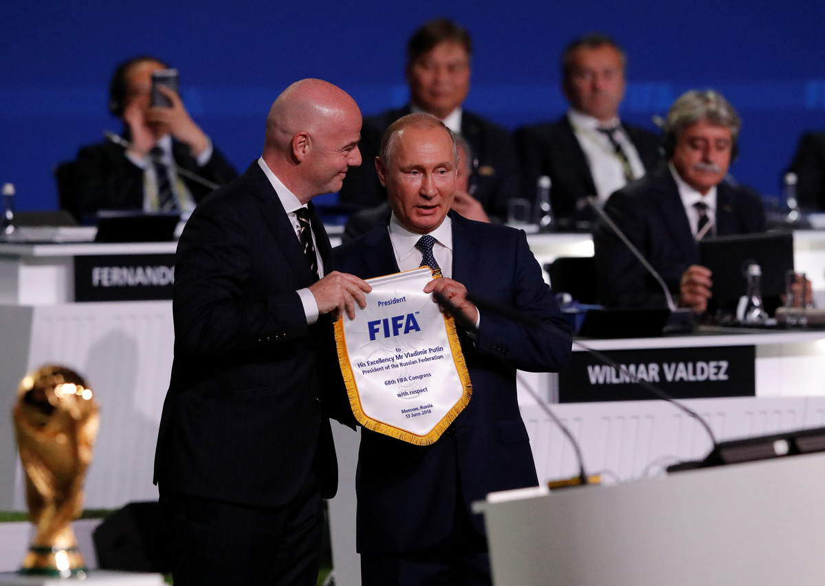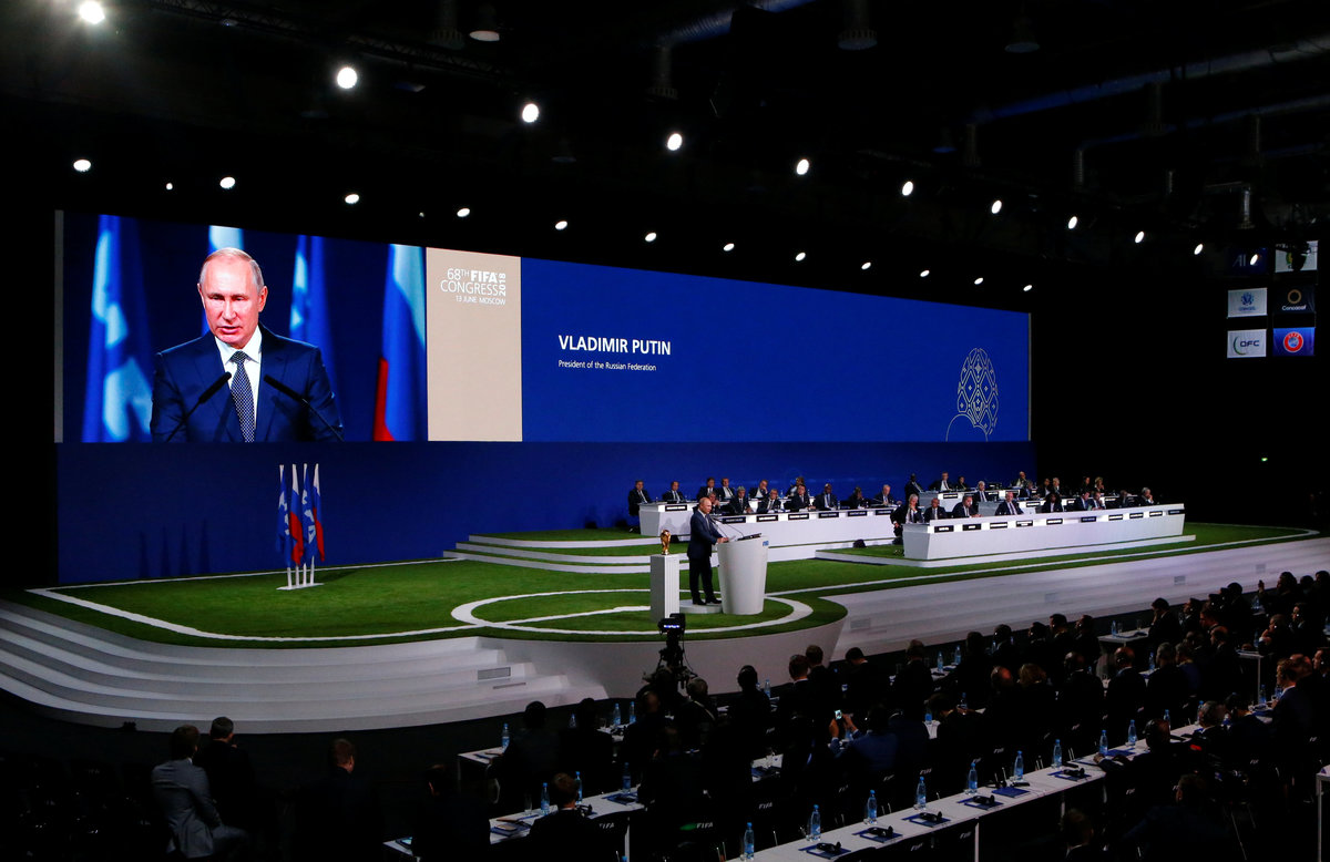 FIFA President Gianni Infantino (R) and Russian President Vladimir Putin attend the 68th FIFA Congress in Moscow, Russia June 13, 2018. REUTERS/Sergei KarpukhinRussian President Vladimir Putin (R) listens to FIFA President Gianni Infantino during the 68th FIFA Congress in Moscow, Russia June 13, 2018. REUTERS/Sergei KarpukhinFIFA President Gianni Infantino (R) and Russian President Vladimir Putin attend the 68th FIFA Congress in Moscow, Russia June 13, 2018. REUTERS/Sergei KarpukhinParticipants listen to Russian President Vladimir Putin during the 68th FIFA Congress in Moscow, Russia June 13, 2018. REUTERS/Sergei Karpukhin