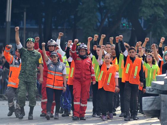 The raised fist was used by rescue workers as a sign demanding silence as they listened for survivors in the rubble.