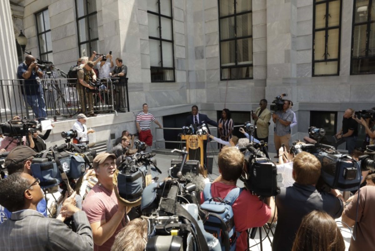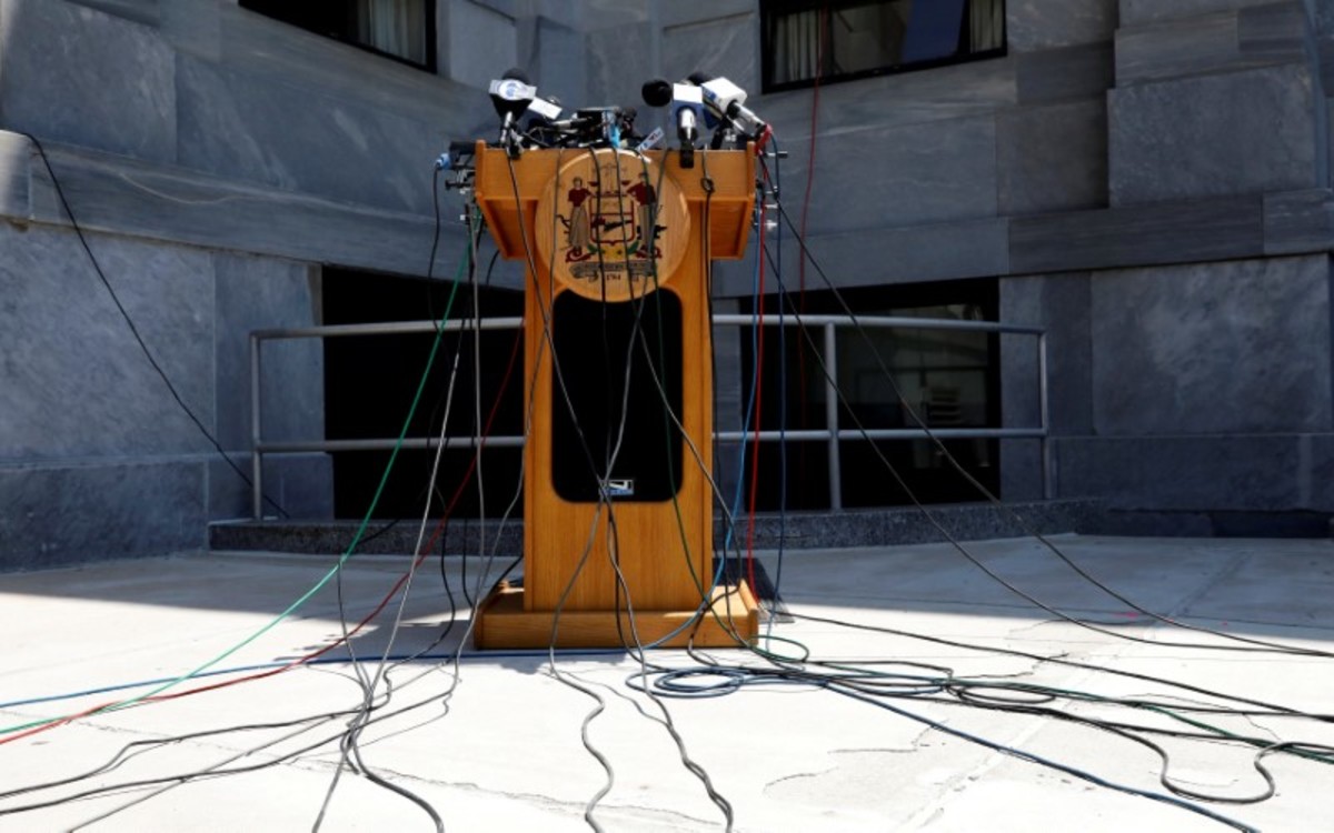 A podium of microphones sits outside the Montgomery County Courthouse as the jury deliberates in Bill Cosby's sexual assault trial in Norristown, Pennsylvania, U.S. June 15, 2017. REUTERS/Brendan McDermid TPX IMAGES OF THE DAY