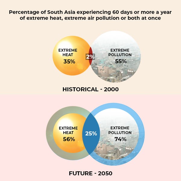 We focused on South Asia because it’s already a climate change hot spot and its population is projected to increase from 1.5 billion today to 2 billion by 2050. Under a worst-case climate change scenario and with little reduction in CO2 and other pollutants, days with both extreme heat and extreme pollution would increase in frequency by 175% in the region, resulting in roughly 78 days a year with those double whammy conditions.