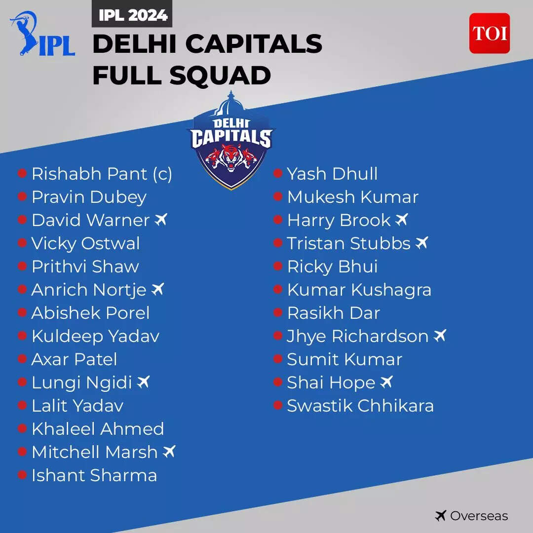 Current squad: Rishabh Pant (c), Pravin Dubey, David Warner, Vicky Ostwal, Prithvi Shaw, Anrich Nortje, Abishek Porel, Kuldeep Yadav, Axar Patel, Lungi Ngidi, Lalit Yadav, Khaleel Ahmed, Mitchell Marsh, Ishant Sharma, Yash Dhull, Mukesh Kumar, Harry Brook, Tristan Stubbs, Ricky Bhui, Kumar Kushagra, Rasikh Dar, Jhye Richardson, Sumit Kumar, Shai Hope, Swastik Chhikara