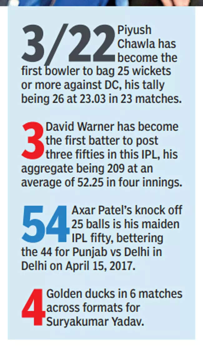 Either side of Axar’s belligerent counterattack at No. 7, Capitals’ frail batting order was exposed again by MI bowling. Skipper David Warner’s scrappy 47-ball 51 notwithstanding, Capitals batters always looked out of breath. Led by the guile of the jarringly-burly Piyush Chawla’s 3/22, MI literally teased the home team’s batting to dismiss them two balls shy of the full 20 overs.