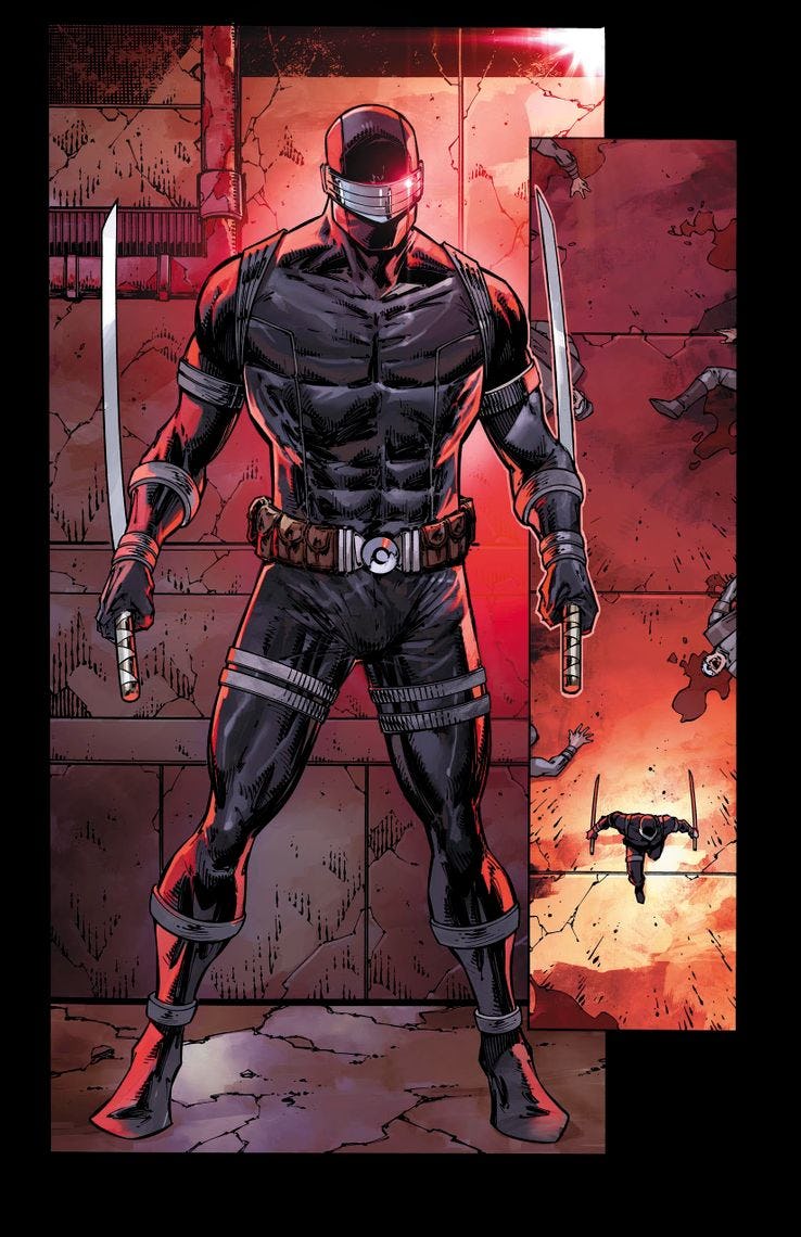 Well, Snake Eyes was a direct influence on the visual language of Deadpool. I've been doing this for 34 years now, but especially over the last decade, I'll go into a comic book store if I'm out of town, and guys will go, "Oh, man, I want to tell you how much I love Deadpool and all that Snake Eyes ninja badass shit that he had going on." Cable was my big military guy, and when I brought in Deadpool, he moved differently. He was my ninja and had guns and swords… and that's because Snake Eyes had guns and swords. So I can immediately transition to Snake Eyes, no problem whatsoever.