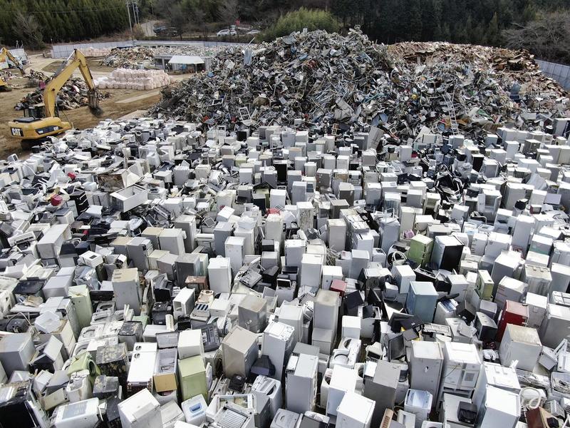 At the makeshift sites, flood-damaged refrigerators, washing machines, furniture and other debris items are piled up. About 20 workers were still processing and sorting the disaster garbage on Sunday for removal to processing plants.