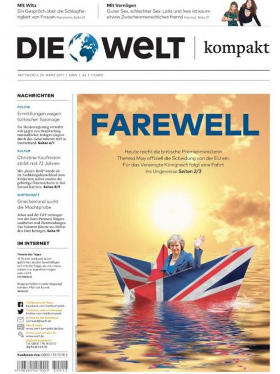 The front page of Die Welt’s “Kompact” sister edition featured headline “Farewell” with a picture of the Prime Minister sailing on a “voyage into the unknown” inside a paper boat made of a union flag.