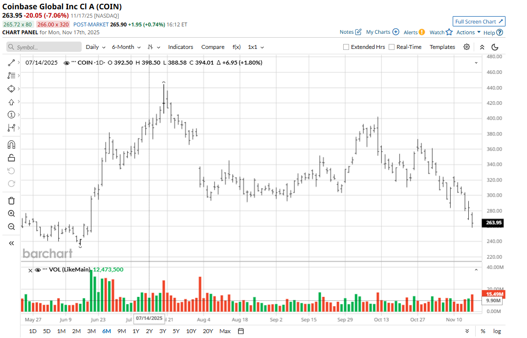 COIN operates as a blockchain infrastructure provider, connecting millions of customers to crypto assets globally, and carries a market capitalization standing at roughly $76.6 billion.
