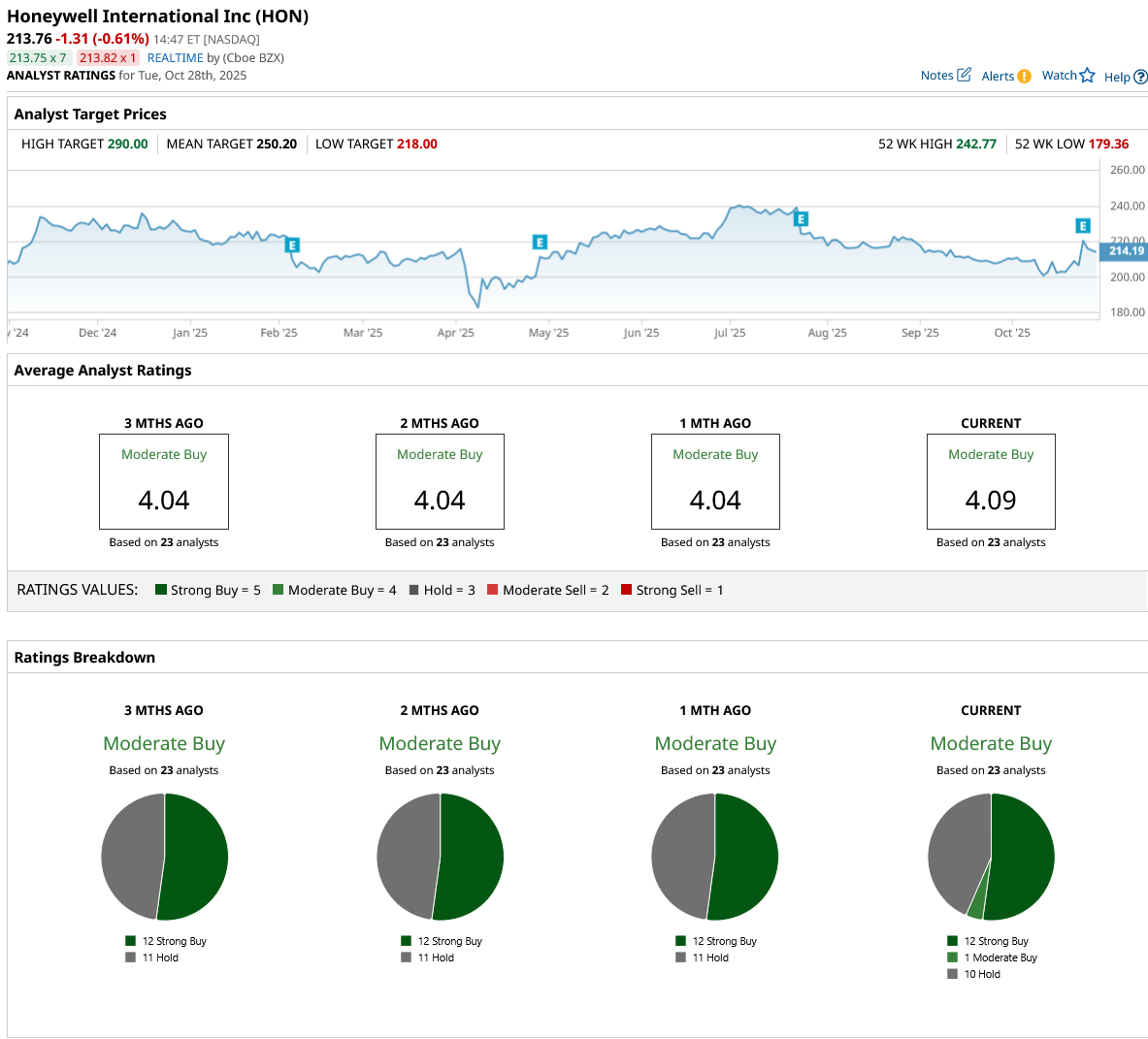 Overall, the analyst's view is still supportive. The consensus of the 23 analysts covering HON stock is a "Moderate Buy," with an average price target of $250.20. Compared to the current price, that works out to about a 17% upside potential.