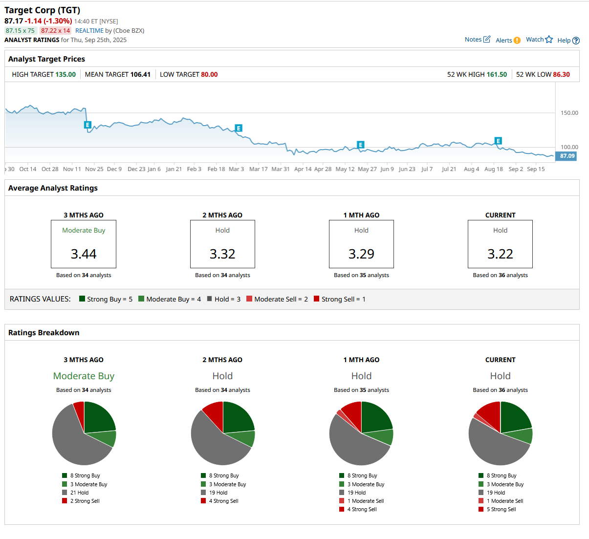 This cautious outlook is mirrored by consensus across Wall Street. The 36 analysts covering TGT stock have placed a consensus "Hold" rating on it. This consistent stance hints at ongoing uncertainty, and most want to see how holiday performance shakes out before making moves. The mean price target is $106.41. At the current stock price of $87.17, that forecast implies a potential upside of about 22% should Target hit its projected stride.