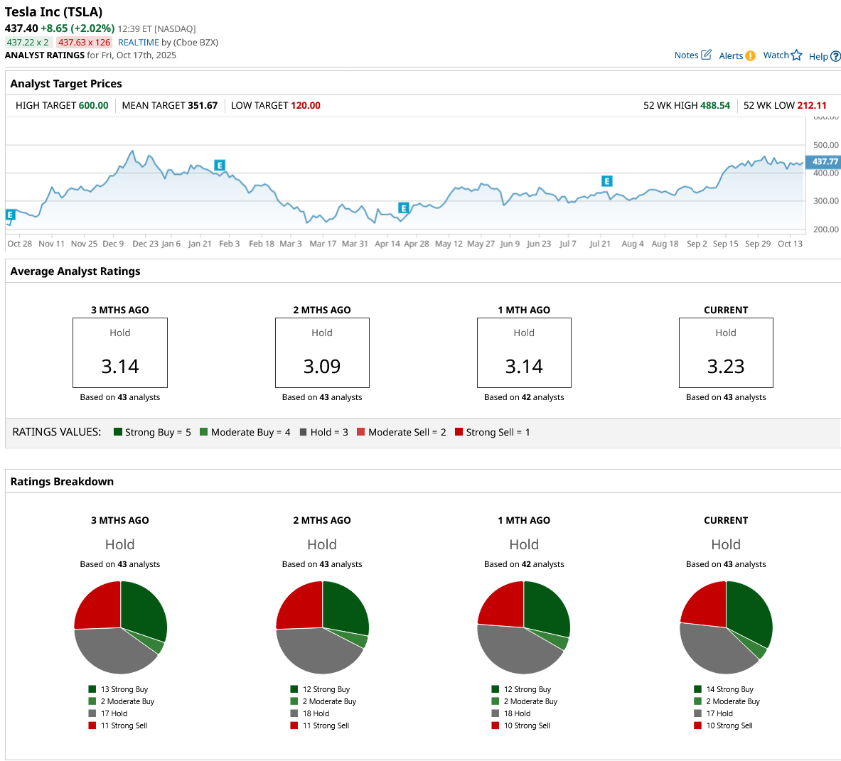 Out of the 43 analysts covering TSLA stock, 14 recommend “Strong Buy,” two recommend “Moderate Buy,” 17 recommend “Hold,” and 10 recommend “Strong Sell.” The average TSLA stock price target is $351.67, below the current price of $437.40.