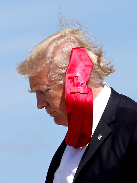 Oversized suits seem to be his signature look. ("I wear Brioni suits, which I buy off the rack," he penned in his 2004 book "Trump: Think Like a Billionaire." "Some people think it's best to have custom-tailored clothing. I don't recommend it unless you have an oddly shaped body, and unless you have a great deal of time.") Photographs of him on more than one occasion _ including at his inauguration _ have captured his extra-long red necktie billowing in the wind with the tails secured with transparent tape.