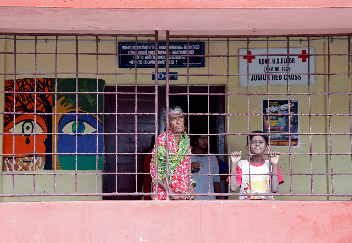 Flood-affected people look out through grilles from the corridor of a school, which has been converted into a temporary relief camp, in Eloor near Kochi, in the southern Indian state of Kerala, August 10, 2019. REUTERS/Sivaram V