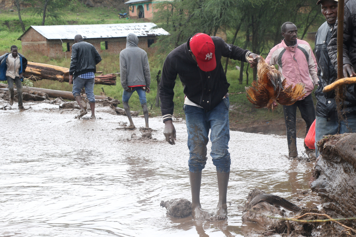 A man holds a hen as people wade in flood waters after heavy rains that caused landslides, in the village of Sebit, West Pokot County, Kenya November 24, 2019. REUTERS/Stringer NO RESALES. NO ARCHIVES.