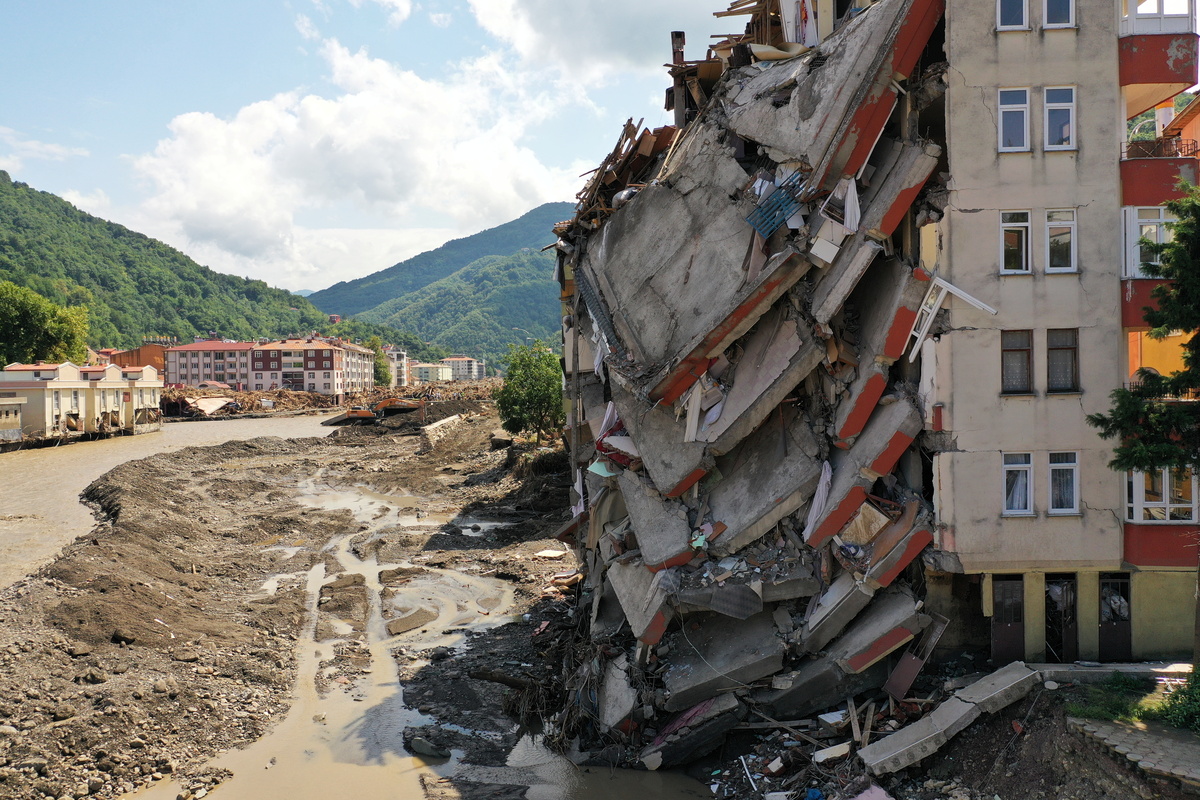 Drone footage showed massive damage in the town of Bozkurt in Kastamonu province, where rescue teams searched demolished buildings at the weekend.