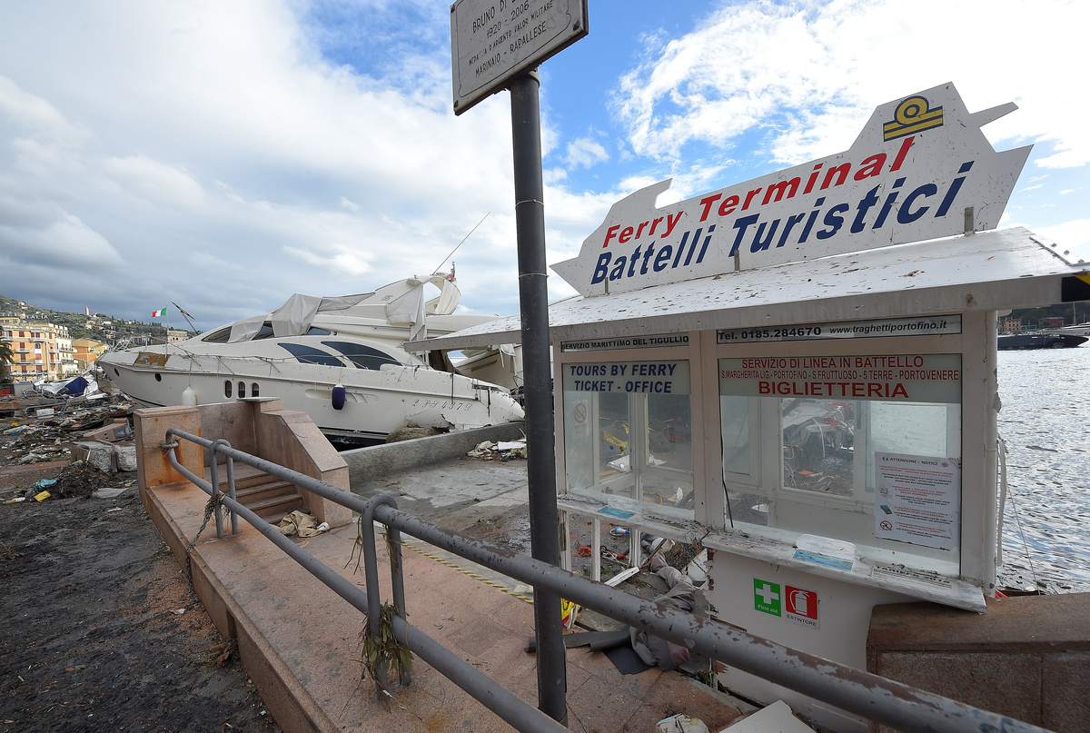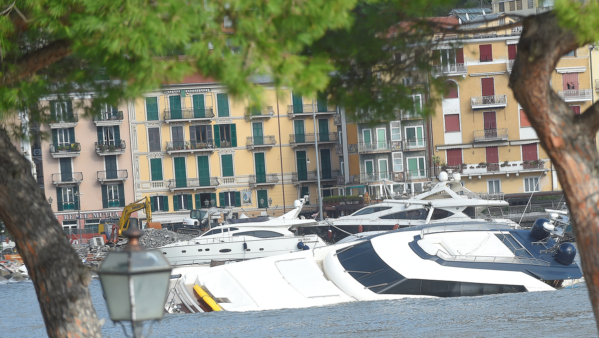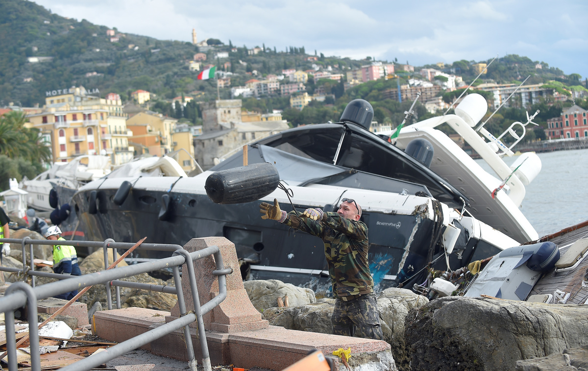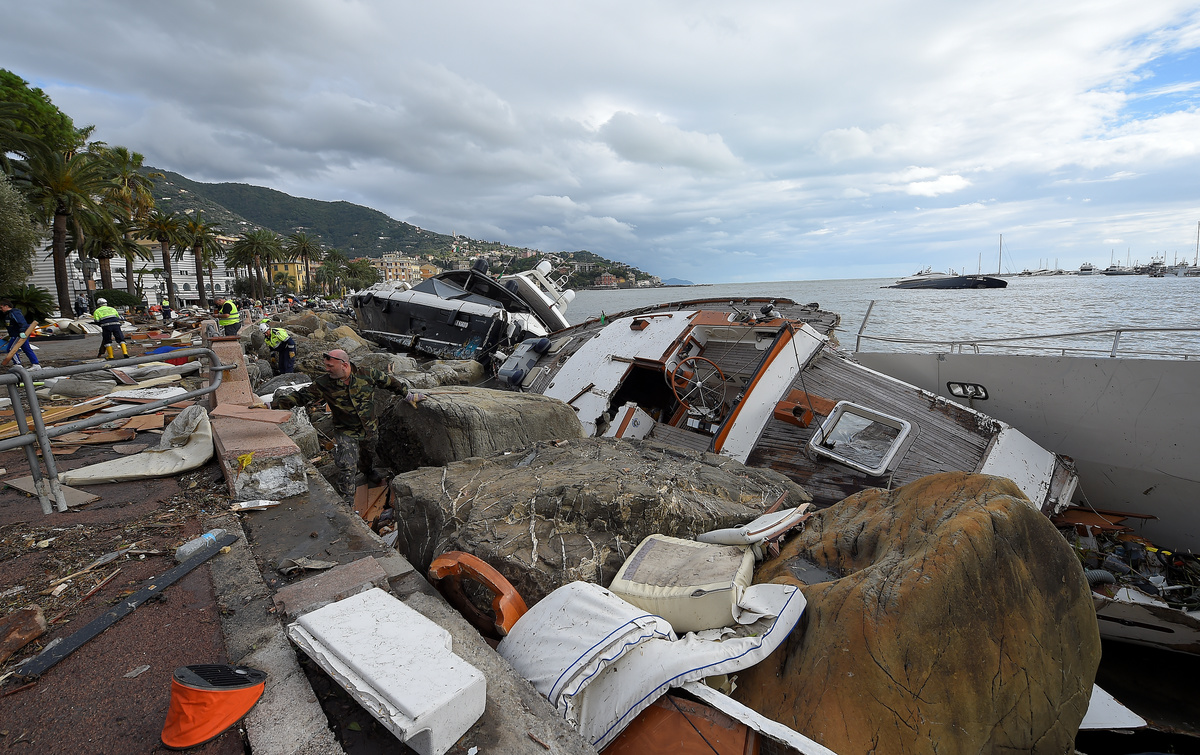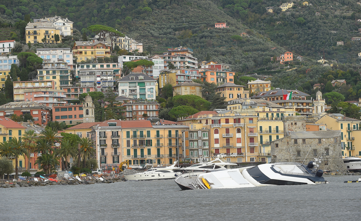 The breakwater walls in the chic seaside resort of Rapallo were destroyed by pounding waves, allowing in a surge of water that toppled dozens of luxury yachts and inflicted heavy damage on the port area.