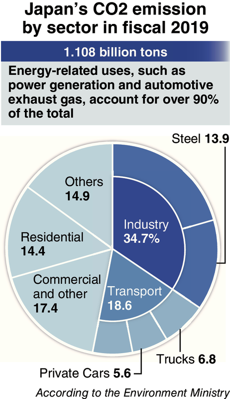 According to the Environment Ministry, Japan's CO2 emissions were about 1.1 billion tons in fiscal 2019. Of this amount, 90% came from energy-related uses such as power plants and gasoline consumption.