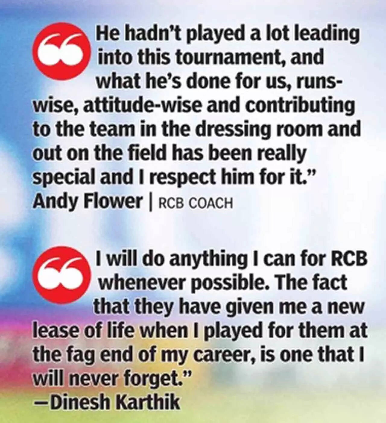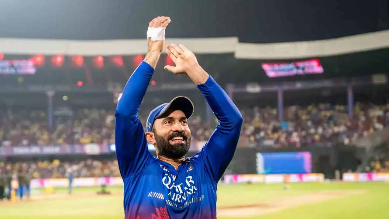 BENGALURU: Much before the Royal Challengers Bengaluru team set out on its victory lap at the M Chinnaswamy stadium following its win over Chennai Super Kings, IPL veteran Dinesh Karthik took a break from the team's celebrations to acknowledge the fans. This was just after his last dance at the venue, the 22 yards on which he rediscovered his form in the last couple of years to stage an unlikely comeback into the Indian squad for the 2022 T20 World Cup.