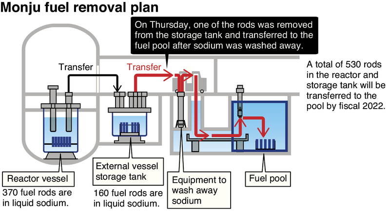 The reactor and the storage tank are filled with liquid sodium because Monju uses it as a coolant to extract heat from the reactor. As sodium reacts violently when exposed to water and air, the work needs to proceed carefully, and the JAEA plans to remove the rods at a pace of one per day for the time being, it said.