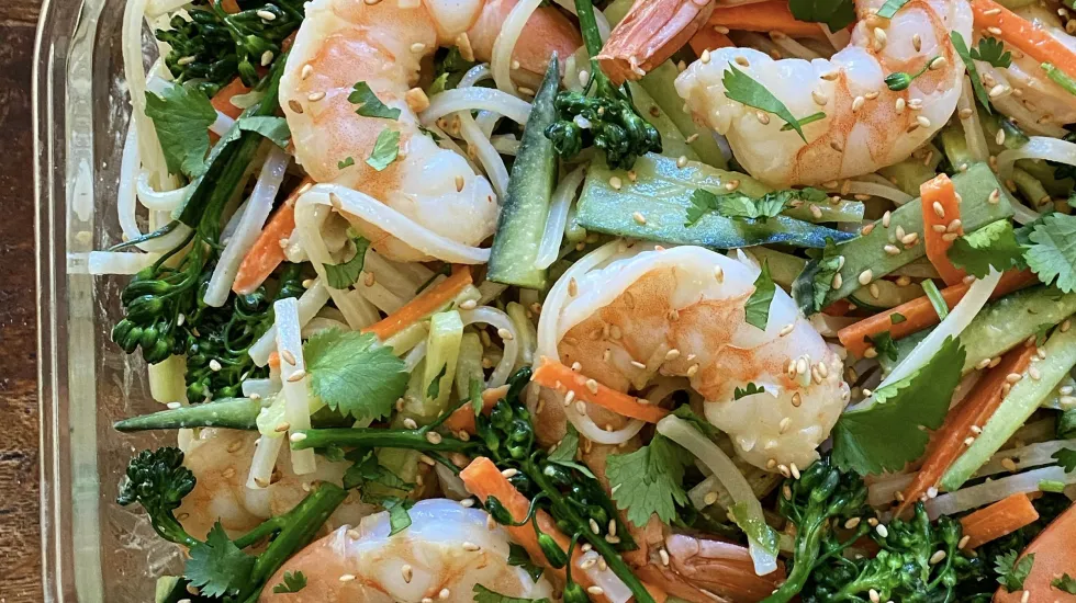 Cook and cool the rice noodles, shrimp and broccolini before assembling. This can be done several hours before prepping; refrigerate the prepped ingredients until assembling.