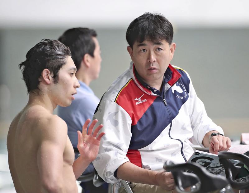 The person keeping a sharp eye on the athletes when they swim is head coach Norimasa Hirai.