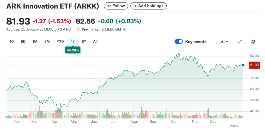 Wood is an idiosyncratic investor, but she has a fervent fanbase buoyed by the performance of her ARK Innovation ETF, which is up 45% over the last 12 months, per Yahoo Finance: