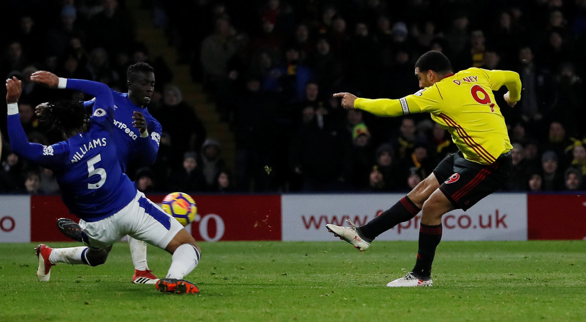 Soccer Football - Premier League - Watford vs Everton - Vicarage Road, Watford, Britain - February 24, 2018 Watford's Troy Deeney scores their first goal REUTERS/David Klein