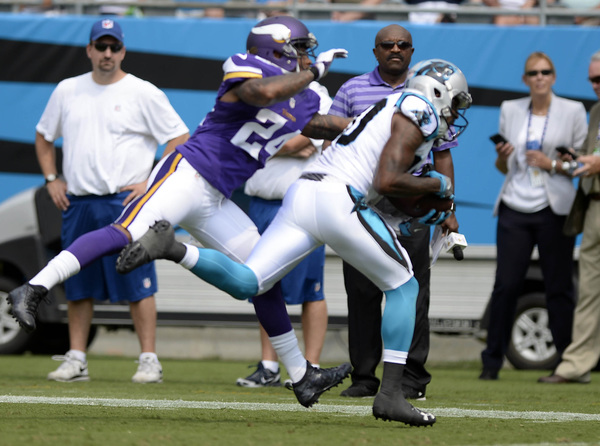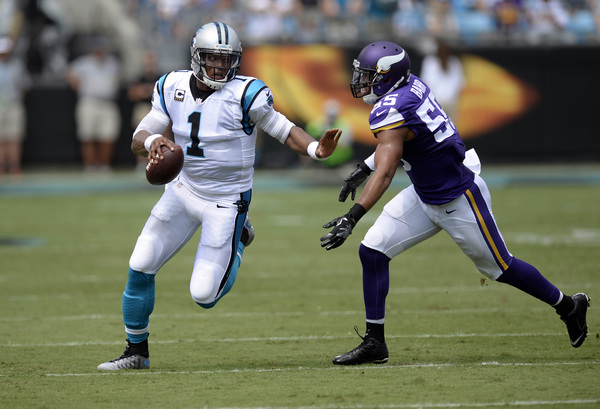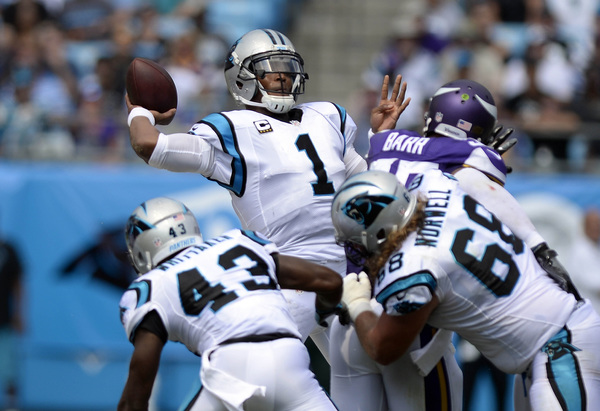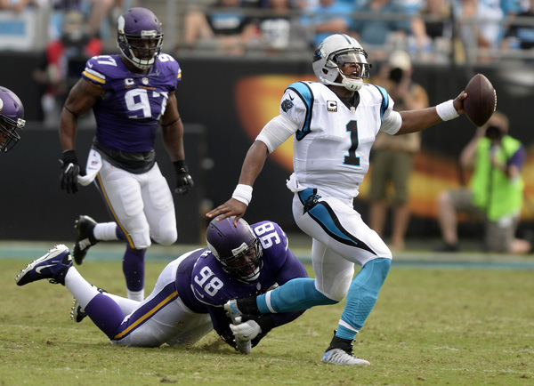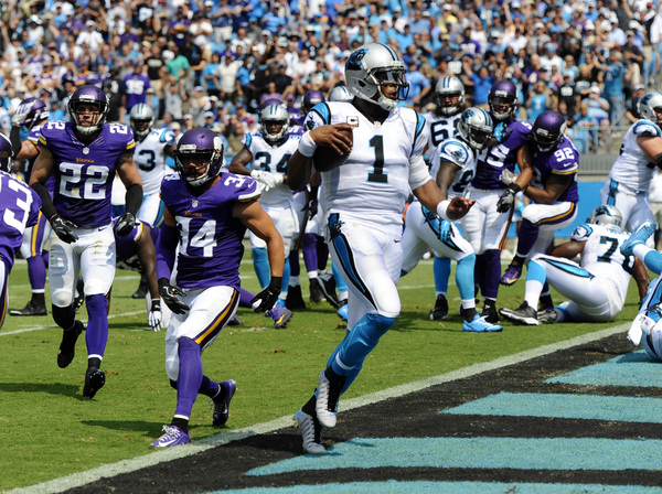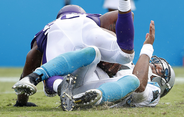 The Vikings briefly knocked Newton out of the game in the second quarter when nose tackle Linval Joseph sacked the big quarterback. After sitting out one play, Newton returned to throw a touchdown pass to running back Fozzy Whittaker, who made safety Harrison Smith and outside linebacker Anthony Barr whiff on their tackle attempts.