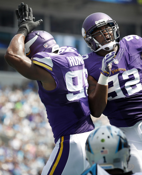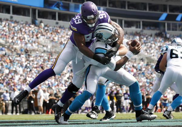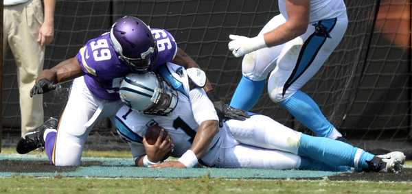 The defense scored the first points for the Vikings, thanks to an assist from their special teams. Punter Jeff Locke pinned the Panthers inside their 5-yard line. Then defensive end Danielle Hunter buried Newton in the end zone for a safety that made it 10-2. Sunday was the third straight game with a sack for Hunter, a second-year defender.