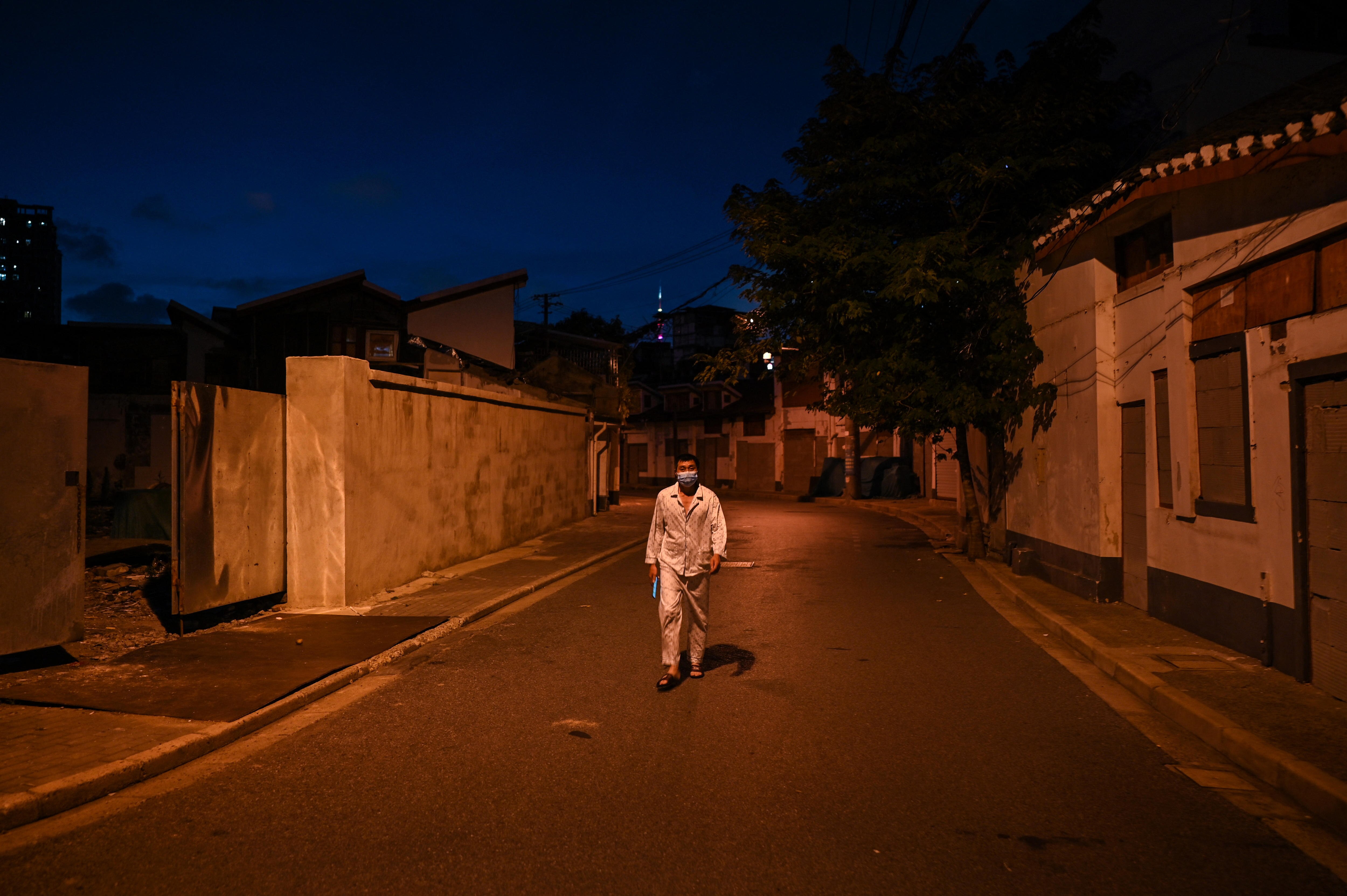 When night falls, the yellow glow of the streetlights envelops the enclave's near-empty alleys, while the Oriental Pearl Tower glows in the distance.