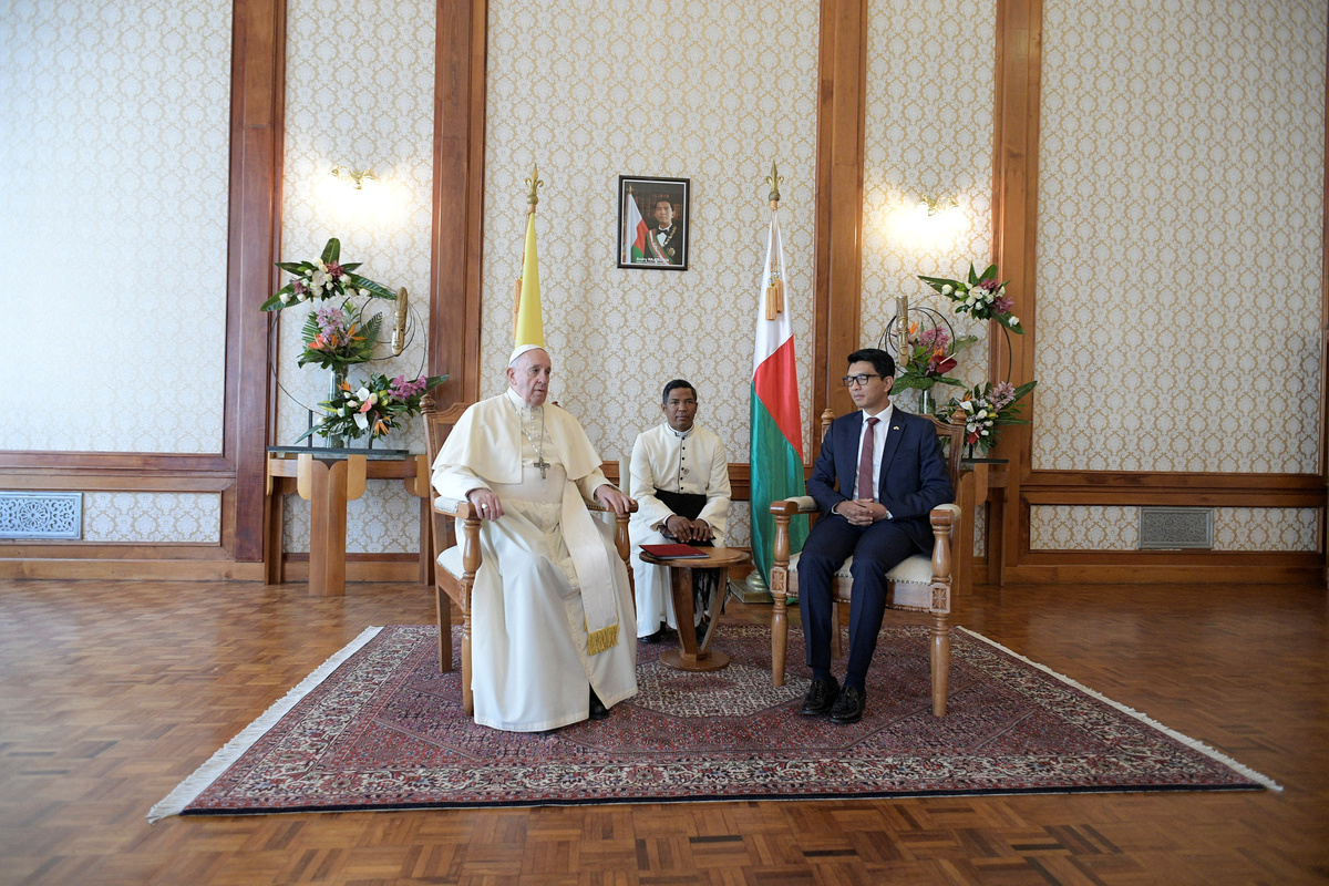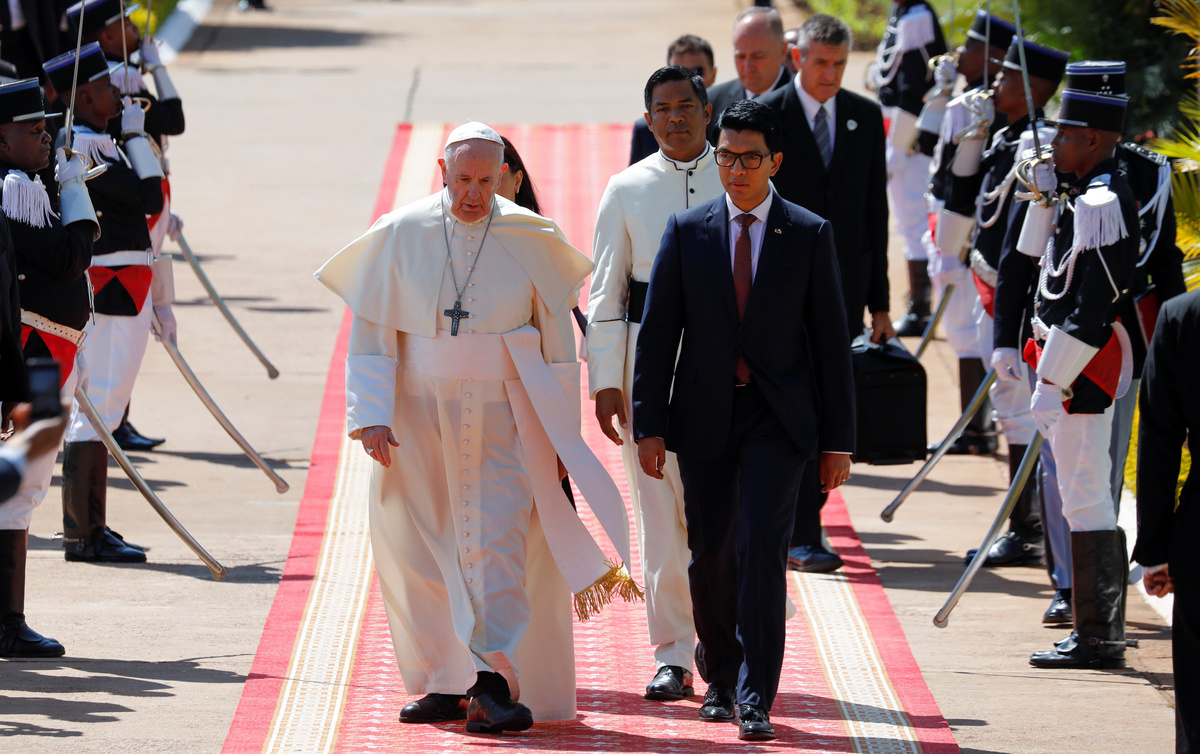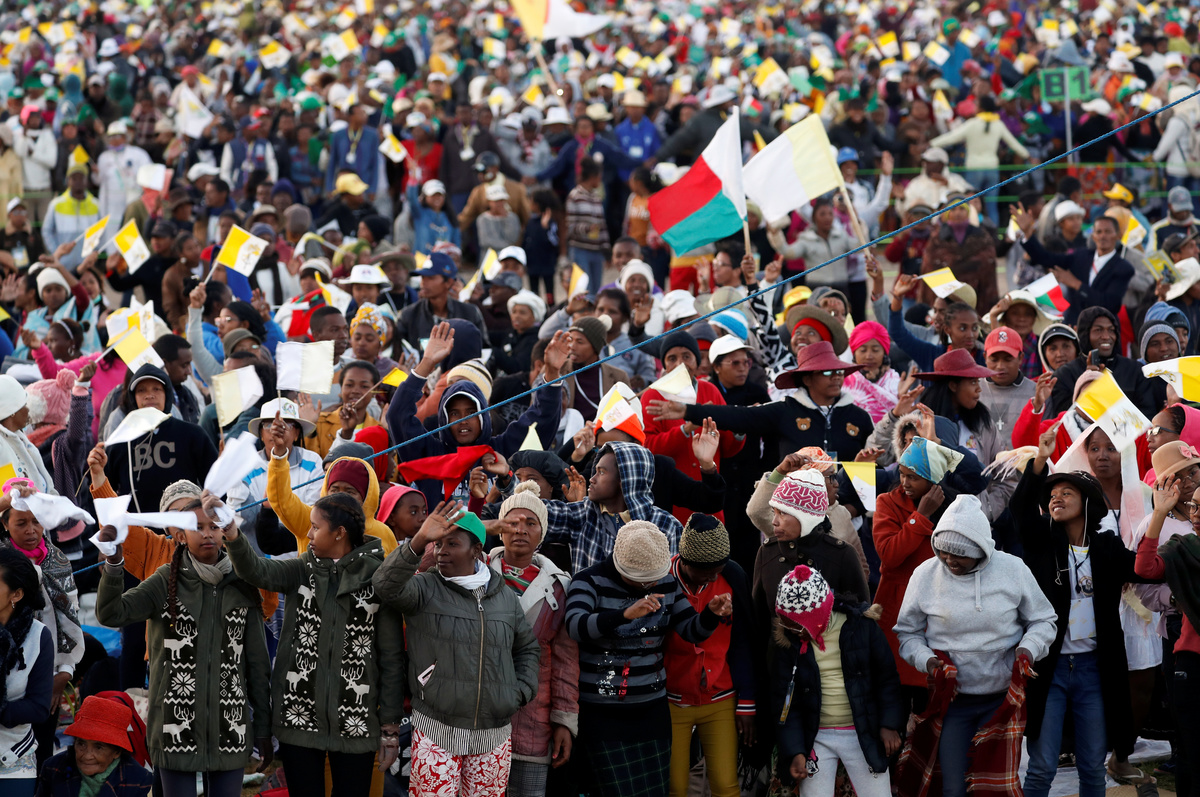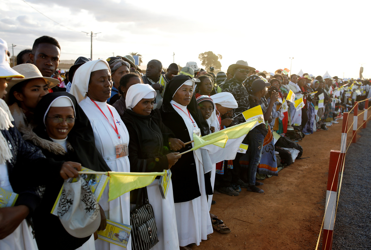 A faithful wears a t-shirt with a picture of Pope Francis as he awaits his arrival for a prayer vigil with youth at the Soamandrakizay Mess site in Antananarivo, Madagascar, September 7, 2019. REUTERS/Baz RatnerFaithful and nuns await Pope Francis' arrival for a prayer vigil with youth at the Soamandrakizay Mess site in Antananarivo, Madagascar, September 7, 2019. REUTERS/Baz RatnerPeople are seen ahead of Pope Francis' arrival for a prayer vigil with youth at the Soamandrakizay Mess site in Antananarivo, Madagascar, September 7, 2019. REUTERS/Yara NardiPeople are seen ahead of Pope Francis' arrival for a prayer vigil with youth at the Soamandrakizay Mess site in Antananarivo, Madagascar, September 7, 2019. REUTERS/Yara NardiPope Francis attends a meeting with bishops of Madagascar in Andohalo Cathedral in Antananarivo, Madagascar September 7, 2019. Vatican Media/Handout via REUTERS Pope Francis greets faithful after leading the mid-morning prayer at the Monastery of the Discalced Carmelites in Antananarivo, Madagascar, September 7, 2019. REUTERS/Yara NardiPope Francis greets faithful after leading the mid-morning prayer at the Monastery of the Discalced Carmelites in Antananarivo, Madagascar, September 7, 2019. REUTERS/Yara NardiPope Francis gives a speech during his meeting with government authorities, leaders of civil society and the diplomatic corps in the Ceremony Building in Antananarivo, Madagascar September 7, 2019. REUTERS/Yara NardiPope Francis meets Madagascar's President Andry Rajoelina at Iavoloha Palace in Antananarivo, Madagascar September 7, 2019. REUTERS/Baz RatnerPope Francis meets with government authorities, leaders of civil society and the diplomatic corps in the Ceremony Building in Antananarivo, Madagascar September 7, 2019. REUTERS/Yara NardiPope Francis meets Madagascar's President Andry Rajoelina at Iavoloha Palace in Antananarivo, Madagascar September 7, 2019. Vatican Media/Handout via REUTERS Pope Francis meets Madagascar's President Andry Rajoelina and his wife Mialy at Iavoloha Palace in Antananarivo, Madagascar September 7, 2019. Vatican Media/Handout via REUTERS Pope Francis meets Madagascar's President Andry Rajoelina in Antananarivo, Madagascar September 7, 2019. REUTERS/Yara NardiPope Francis and Madagascar's President Andry Rajoelina attend a welcoming ceremony at Ivato International Airport in Antananarivo, Madagascar, September 6, 2019. REUTERS/Yara NardiPope Francis walks with Madagascar's President Andry Rajoelina during a welcoming ceremony at Ivato International Airport as he arrives for a three-day visit, in Antananarivo, Madagascar September 6, 2019. REUTERS/Baz RatnerPope Francis talks with Sister Maria Maddalena dell’Annunciazione at the Monastery of the Discalced Carmelites in Antananarivo, Madagascar, September 7, 2019. REUTERS/Yara NardiPeople await the arrival of Pope Francis for the mid-morning prayer at the Monastery of the Discalced Carmelites in Antananarivo, Madagascar, September 7, 2019. REUTERS/Yara Nardi