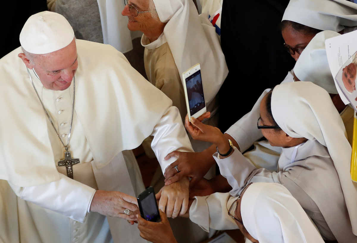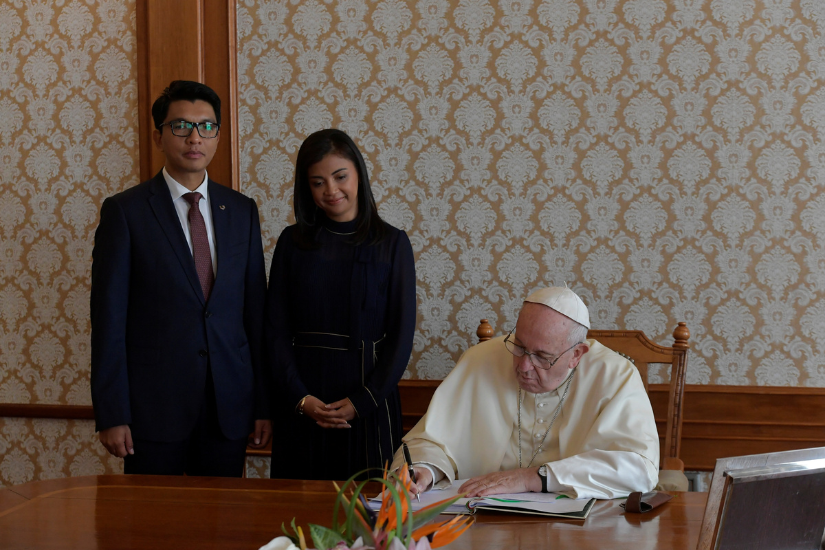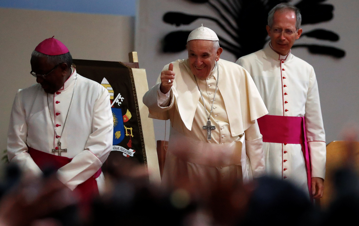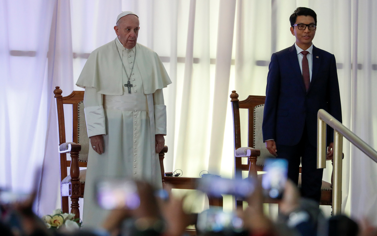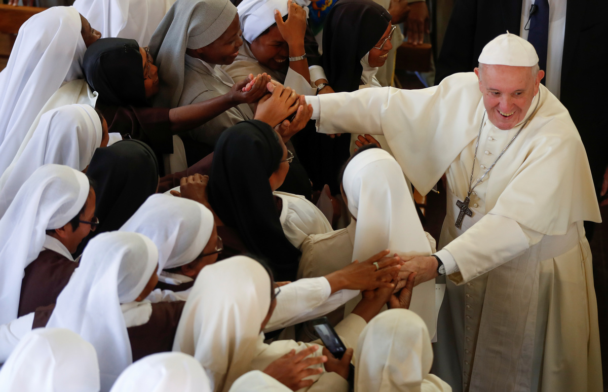 A faithful wears a t-shirt with a picture of Pope Francis as he awaits his arrival for a prayer vigil with youth at the Soamandrakizay Mess site in Antananarivo, Madagascar, September 7, 2019. REUTERS/Baz RatnerFaithful and nuns await Pope Francis' arrival for a prayer vigil with youth at the Soamandrakizay Mess site in Antananarivo, Madagascar, September 7, 2019. REUTERS/Baz RatnerPeople are seen ahead of Pope Francis' arrival for a prayer vigil with youth at the Soamandrakizay Mess site in Antananarivo, Madagascar, September 7, 2019. REUTERS/Yara NardiPeople are seen ahead of Pope Francis' arrival for a prayer vigil with youth at the Soamandrakizay Mess site in Antananarivo, Madagascar, September 7, 2019. REUTERS/Yara NardiPope Francis attends a meeting with bishops of Madagascar in Andohalo Cathedral in Antananarivo, Madagascar September 7, 2019. Vatican Media/Handout via REUTERS Pope Francis greets faithful after leading the mid-morning prayer at the Monastery of the Discalced Carmelites in Antananarivo, Madagascar, September 7, 2019. REUTERS/Yara NardiPope Francis greets faithful after leading the mid-morning prayer at the Monastery of the Discalced Carmelites in Antananarivo, Madagascar, September 7, 2019. REUTERS/Yara NardiPope Francis gives a speech during his meeting with government authorities, leaders of civil society and the diplomatic corps in the Ceremony Building in Antananarivo, Madagascar September 7, 2019. REUTERS/Yara NardiPope Francis meets Madagascar's President Andry Rajoelina at Iavoloha Palace in Antananarivo, Madagascar September 7, 2019. REUTERS/Baz RatnerPope Francis meets with government authorities, leaders of civil society and the diplomatic corps in the Ceremony Building in Antananarivo, Madagascar September 7, 2019. REUTERS/Yara NardiPope Francis meets Madagascar's President Andry Rajoelina at Iavoloha Palace in Antananarivo, Madagascar September 7, 2019. Vatican Media/Handout via REUTERS Pope Francis meets Madagascar's President Andry Rajoelina and his wife Mialy at Iavoloha Palace in Antananarivo, Madagascar September 7, 2019. Vatican Media/Handout via REUTERS Pope Francis meets Madagascar's President Andry Rajoelina in Antananarivo, Madagascar September 7, 2019. REUTERS/Yara NardiPope Francis and Madagascar's President Andry Rajoelina attend a welcoming ceremony at Ivato International Airport in Antananarivo, Madagascar, September 6, 2019. REUTERS/Yara NardiPope Francis walks with Madagascar's President Andry Rajoelina during a welcoming ceremony at Ivato International Airport as he arrives for a three-day visit, in Antananarivo, Madagascar September 6, 2019. REUTERS/Baz RatnerPope Francis talks with Sister Maria Maddalena dell’Annunciazione at the Monastery of the Discalced Carmelites in Antananarivo, Madagascar, September 7, 2019. REUTERS/Yara NardiPeople await the arrival of Pope Francis for the mid-morning prayer at the Monastery of the Discalced Carmelites in Antananarivo, Madagascar, September 7, 2019. REUTERS/Yara Nardi