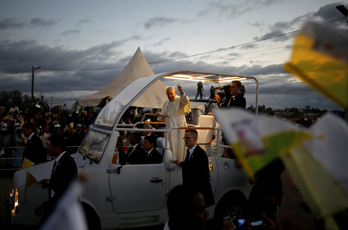 Pope Francis waves from the pope mobile as he arrives for a prayer vigil with youth at the Soamandrakizay Mess site in Antananarivo, Madagascar, September 7, 2019. REUTERS/Baz Ratner