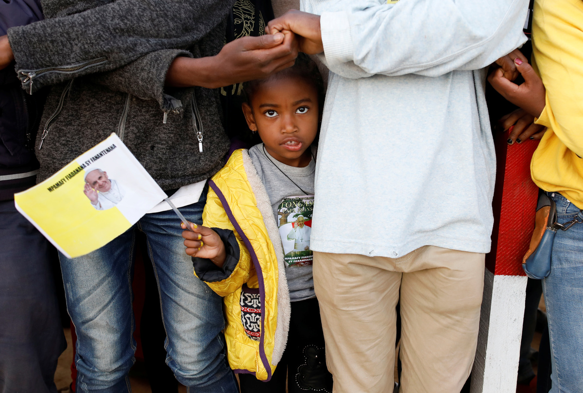 A child awaits Pope Francis' arrival for a prayer vigil with youth at the Soamandrakizay Mess site in Antananarivo, Madagascar, September 7, 2019. REUTERS/Baz Ratner