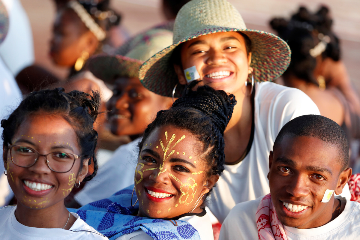 Performers smile as they await Pope Francis' arrival for a prayer vigil with youth at the Soamandrakizay Mess site in Antananarivo, Madagascar, September 7, 2019. REUTERS/Yara Nardi