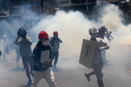 The protesters in Yangon were chased as they tried to gather at their usual meeting spot at the Hledan Center intersection. Demonstrators scattered and sought to rinse their faces with water in vain attempts to ease the irritating effects of the gas.