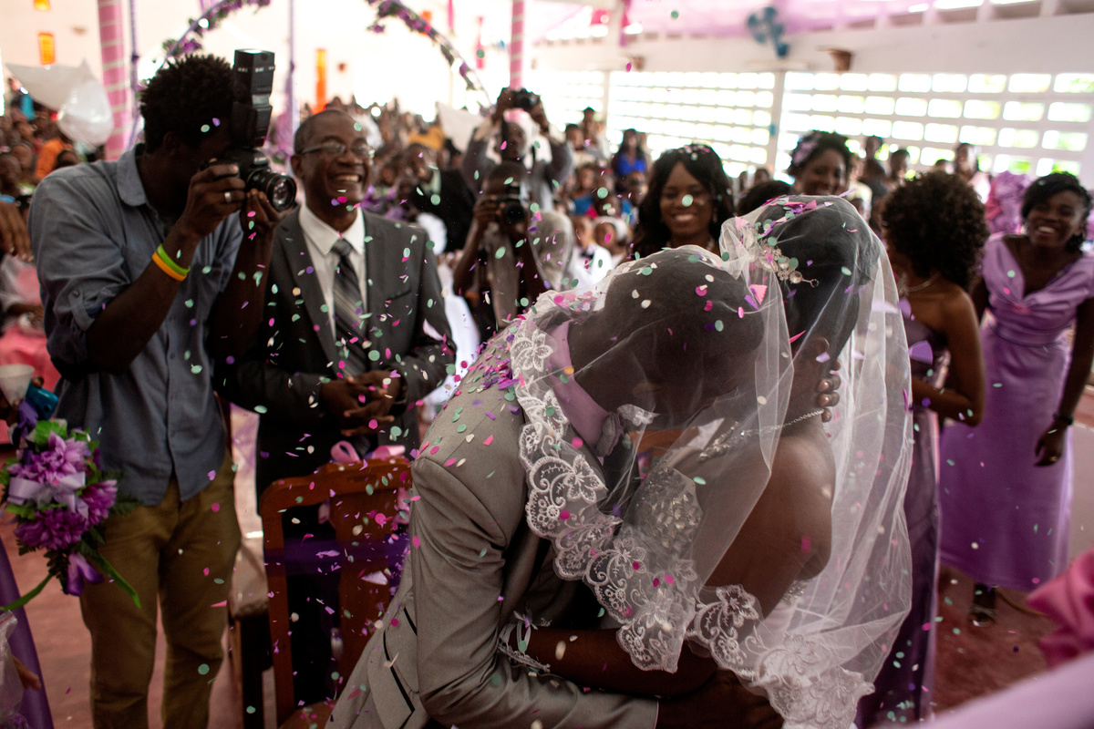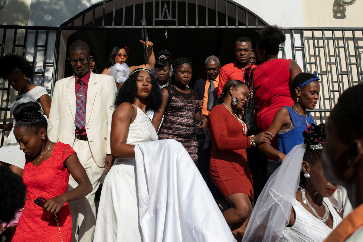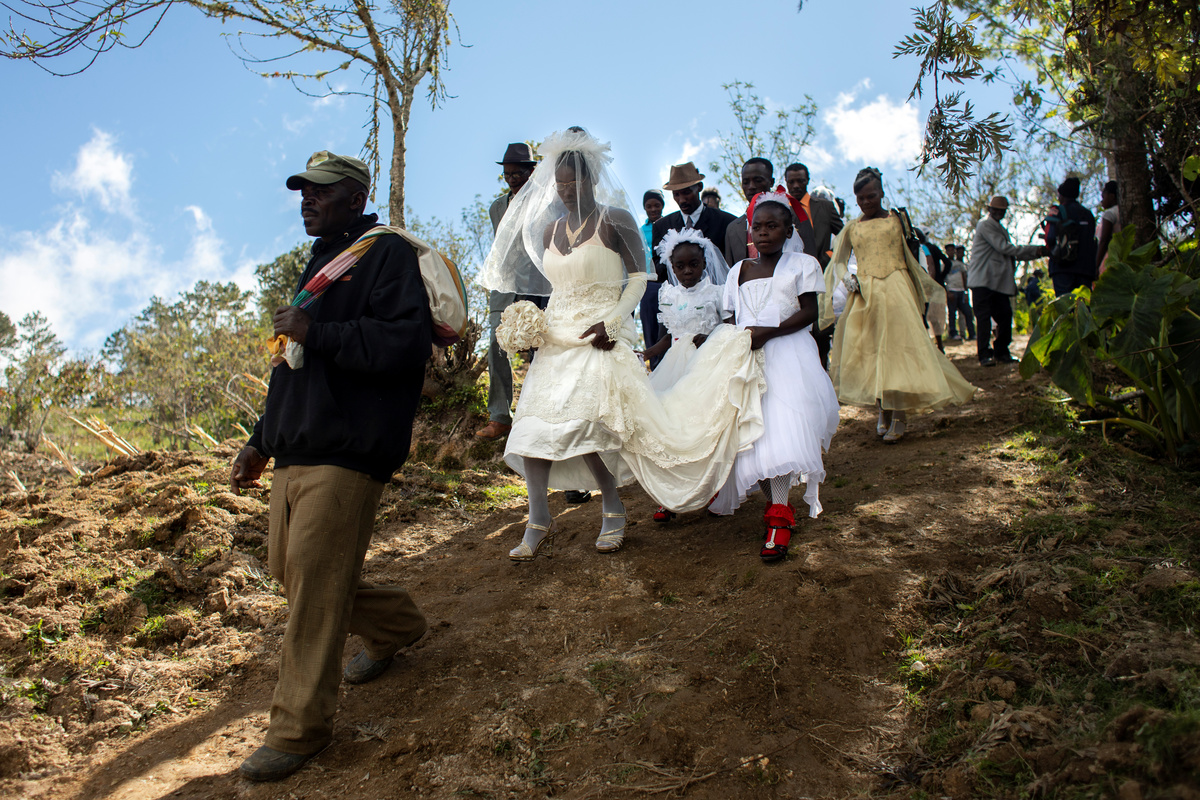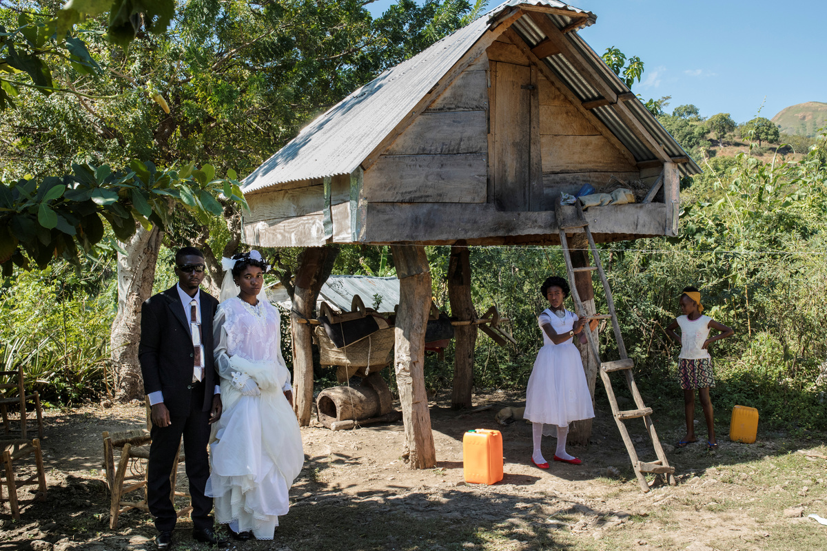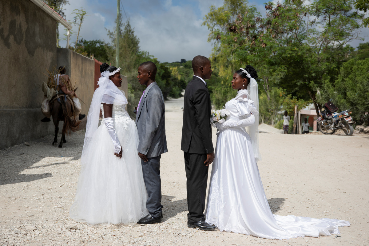 Musician Duckyns St-Eloi, who is known as 'Zikiki' sings to his bride Mirla-Samuelle Pierre as she enters the church with her father Pierre Obas on their wedding day at Eglise de l'Universite Adventiste d'Haiti, a church in Diquini, Carrefour, Haiti, December 28, 2017. Pierre and Zikiki wed in church, mainly to please Pierre's parents. But the theme of the wedding decoration was 'rastafari,' reflecting the culture of the dreadlocked groom. Like all but the wealthiest Haitians, they chose not to spend any money on a grand reception or honeymoon. "Instead, that same evening we went out to a nightclub," said Zikiki, "and we had a lot of fun together." REUTERS/Valerie Baeriswyl Dalina poses for a photograph next to her small bride on the day of her wedding, at a hair salon in Delmas, Port-au-Prince Arrondissement, Haiti, July 30, 2015. REUTERS/Valerie Baeriswyl Brides Roselene Saint Juste and Mireille Mathurin, who got married in a joint ceremony to cousins Sony Vernet and Herve Vernet, get ready on their wedding day in Mariani, Haiti, April 15, 2017. REUTERS/Valerie Baeriswyl Mauseline Greffin, a shopkeeper, has her eyebrows done by a friend on the day of her wedding to Favilson Pierre, a taxi driver, who she met at church, at a house belonging to Greffin's friend in Carrefour, Haiti, January 2, 2016. REUTERS/Valerie Baeriswyl Abydarlyne Jouth, poses for a photograph with her bridesmaids, Ketlove Sainfleur, Adline Jouthe, Tamas Jean Pierre, Marie Claudine Nozil during a fitting for Jouth's and Chelson Ermoza's African themed wedding, in Delmas, Port au Prince, Haiti, December 10, 2017. "We chose to get married like this because we wanted to get out of the traditional European wedding pattern. We wanted to be ourselves and propose another form of costume, another model of ceremony for married people in Haiti," said Jouth. REUTERS/Valerie Baeriswyl Renold St Hilaire, 56, a church friend of Beane Jean & Franck's, who are getting married, irons a wedding guest's dress, before Jean's and Franck's wedding, at her home in L'Asile, Haiti, April 14, 2018. REUTERS/Valerie Baeriswyl Edeline Philipe, 17, the announcer, who will announce the arrival of the bride as part of a Haitian wedding tradition, waits for Sherlyne Fernand, the bride, who works as a merchant, to arrive before making their way in a procession to the church, on the wedding day of Fernand and Imado Joinville, who works as a security guard, in Leogane Arrondissement, Haiti, October 28, 2017. The bridal procession in the church can include friends playing the part of a king and queen, while the bridesmaids and groomsmen often dress so similarly to the bride and groom that it can be difficult to define, from outside, who is actually getting wed. REUTERS/Valerie Baeriswyl Father of the bride Merilus Bonheur, who works as a forest ranger, leads his daughter Christela Bonheur, 29, and their relatives to church on the day of Christela's wedding to Jocithe Auguste, in Foret des Pins, Zone Mare Rouge, Haiti, January 14, 2017. "We used to talk on the phone when I went to school in Croix-des-Bouquets. He lived in the Dominican Republic. We spent three years together before he asked for my hand," Bonheur says about Auguste. REUTERS/Valerie Baeriswyl Joseph, a teacher, and Louimene Louis pose for a photograph with Midene Belantine, Louis's cousin and Benita Estima, Joseph's cousin, in the courtyard of a family friend's house before getting married in Bouli, Centre Department, Haiti, December 1, 2018. REUTERS/Valerie Baeriswyl Father Duportal, of the Catholic parish Boucan Carre, who is marrying Silvanes Joseph and Louimene Louis, listens to Louimene Louis's confessions, as part of a Haitian marriage tradition where both the bride and groom have to go to confession before getting married, in Bouli, Centre Department, Haiti, December 1, 2018. REUTERS/Valerie Baeriswyl Vanessa Dorsainvil and Wesley Desir are surrounded by their godparents during a couple's blessing at Shekinah Adventist Church, during their wedding day in Port-au-Prince, Haiti, August 2, 2015. REUTERS/Valerie Baeriswyl Anelia Marcelus, 36, and Claudel Francois, 38, exchange rings during their wedding ceremony at Salem Evangelical Baptist Church, Port-au-Prince Arrondissement, Haiti, May 28, 2016. REUTERS/Valerie Baeriswyl Julio and Dalina, who met while studying at the same university, kiss each other for the first time as husband and wife at a church in Delmas, Port-au-Prince, Haiti, July 30, 2015. REUTERS/Valerie Baeriswyl Iseleine Granvil, the bride, who works as a teacher, reacts as she is photographed by guests on their smartphones during her wedding day with Etienne Termidor, a carpenter, in Cap Haitien, Haiti, October 31, 2017. REUTERS/Valerie Baeriswyl Woodna Vernet, the godmother, wears a white dress as she and wedding guests at Mireille Mathurin and Herve Vernet's wedding, leave the church, in Mariani, Haiti, April 15, 2017. Mathurin and Vernet got married in a double wedding ceremony. The bridesmaids and groomsmen often dress so similarly to the bride and groom that it can be difficult to define, from outside, who is actually getting wed. REUTERS/Valerie Baeriswyl Guests load a generator onto a bus to be taken to Tatiana Delpeche and Markens Dorcius', who are both teachers, wedding venue on their wedding day in Liancourt, Artibonite, Haiti, November 18, 2017. A generator is an essential element for a wedding in Haiti, especially in the countryside, where some areas are not electrified. REUTERS/Valerie Baeriswyl Santhonax Toussaint, 25, and Luisemene Antoine, 22, return from the church where they got married, as they make their way into their wedding reception in Toussaint's family courtyard where upon arrival, their in-laws will welcome them by throwing holy water and rice to bless the wedding, in Thiotte, Sud-Est Department, Haiti, December 7, 2017. REUTERS/Valerie Baeriswyl Christella Bonheur, 29, sits down after marrying Jocithe Auguste, 30, on their wedding day at a ch