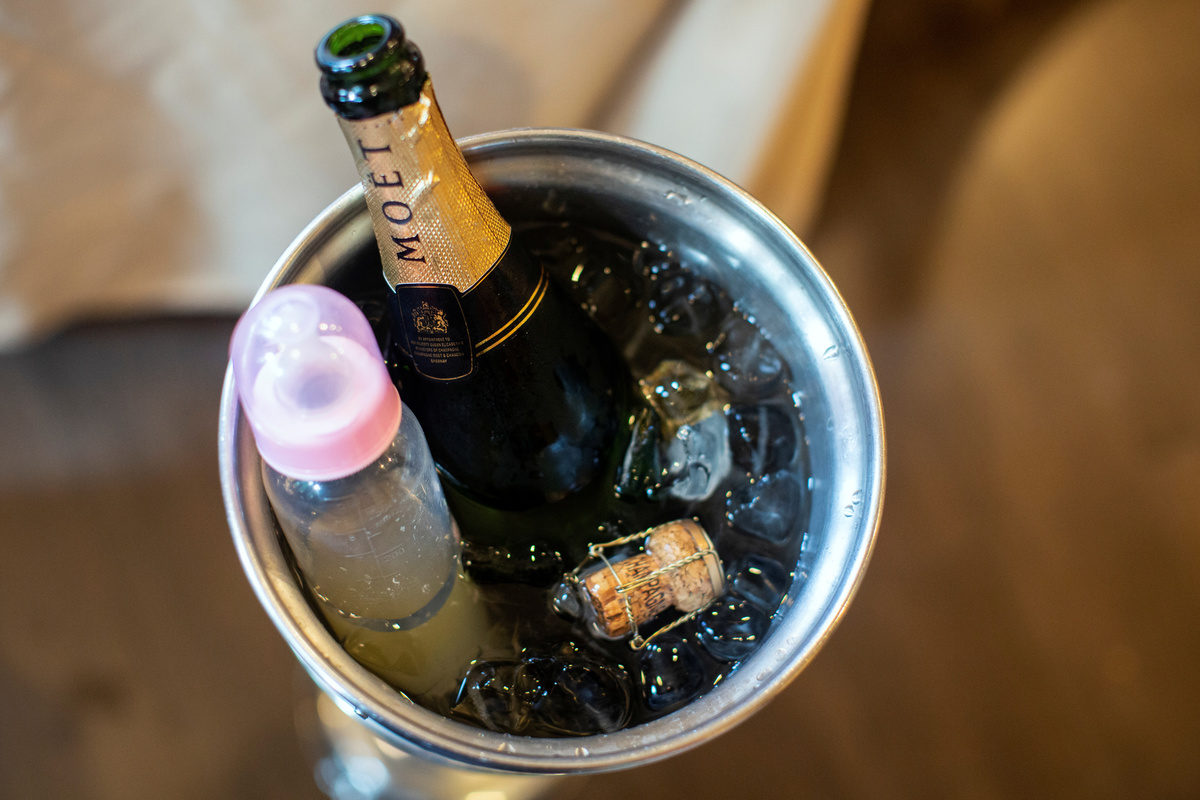 A baby's bottle, belonging to the nine-month-old daughter of Luc Andrew Abraham and Wefny Tinor Abraham, who are getting married, is cooled down together with a bottle of champagne in an ice bucket, on the day of Luc and Wefny's wedding day, at a hotel in Petion-Ville, Port au Prince, Haiti, May 13, 2016. REUTERS/Valerie Baeriswyl