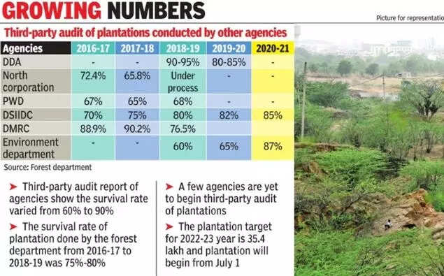 According to the forest department, which compiled the third-party audit reports carried out by several agencies, DDA achieved the maximum survival rate at 90-95% in 2018-19. Many authorities managed to achieve a survival rate of 80% and above.