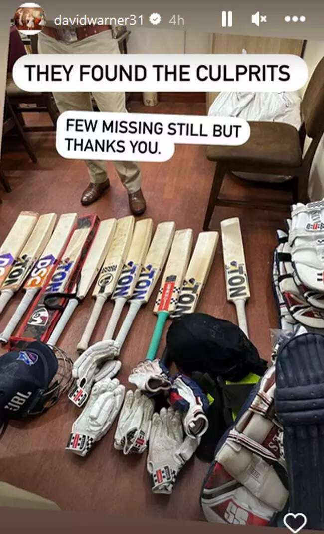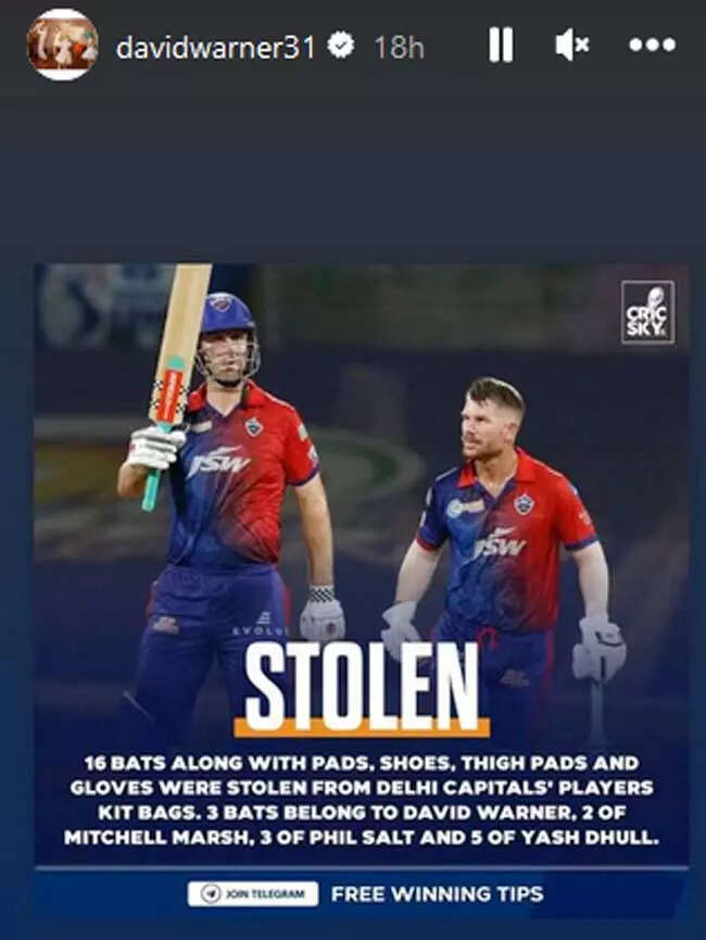 "Stolen. 16 bats along with pads, shoes, thigh pads, gloves were stolen from the Delhi Capitals' players kit bags. 3 bats belong to David Warner, 2 of Mitchell Marsh, three of Phil Salt and five of Yash Dhull," the Australian opener had written on social media.