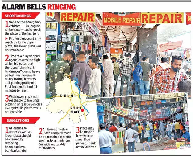 The fire service recommended urgent measures like a ban on roadside parking and freeing the market of hawkers. It also wanted a ramp constructed for emergency vehicles to reach the inner areas of Nehru Place.