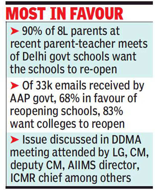 The issue of reopening of educational institutions was discussed in detail during the Delhi Disaster Management Authority (DDMA) meeting. It was chaired by lieutenant governor Anil Baijal and attended by chief minister Arvind Kejriwal, deputy CM Manish Sisodia, Dr VK Paul from NITI Aayog, Dr Randeep Guleria from AIIMS and Prof Balram Bhargava from ICMR, besides others.