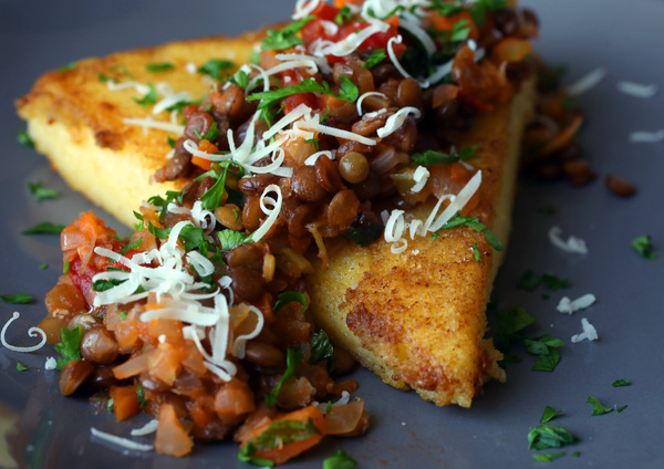 It's a straightforward dish, lentils plus garlic plus mirepoix plus tomatoes on polenta, but I made my own version of it fancier by pan-frying the polenta. All it takes is the forethought to make the polenta the night before. By morning, it can be cut into wedges and then fried until it is crisp and golden on the outside, and creamy on the inside. It's almost too good for lentils, but not quite.
