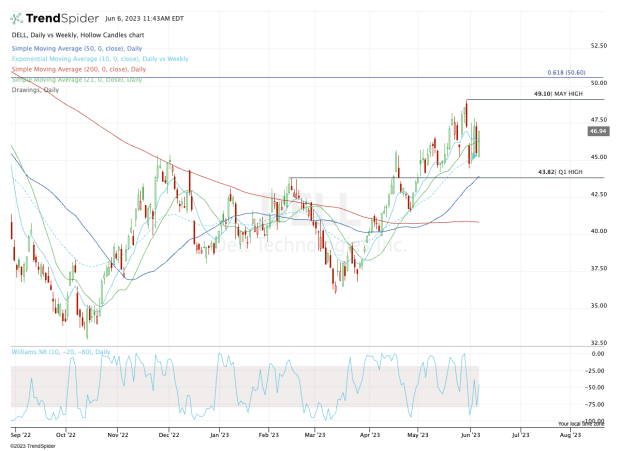 If the shares instead continue higher from here, see how Dell stock handles $47.50. Above this measure puts the May high in play near $49 and above that, the 61.8% retracement of the 2022 range comes into play near $50.50.