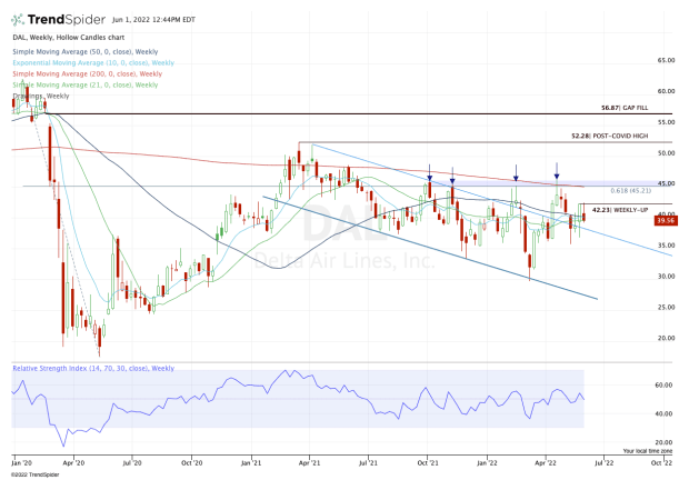 Looking at the weekly chart above, investors can see that Delta stock tried to go weekly-up by clearing last week’s high at $42.23. However, buyers couldn’t keep up the momentum and shares reversed lower.